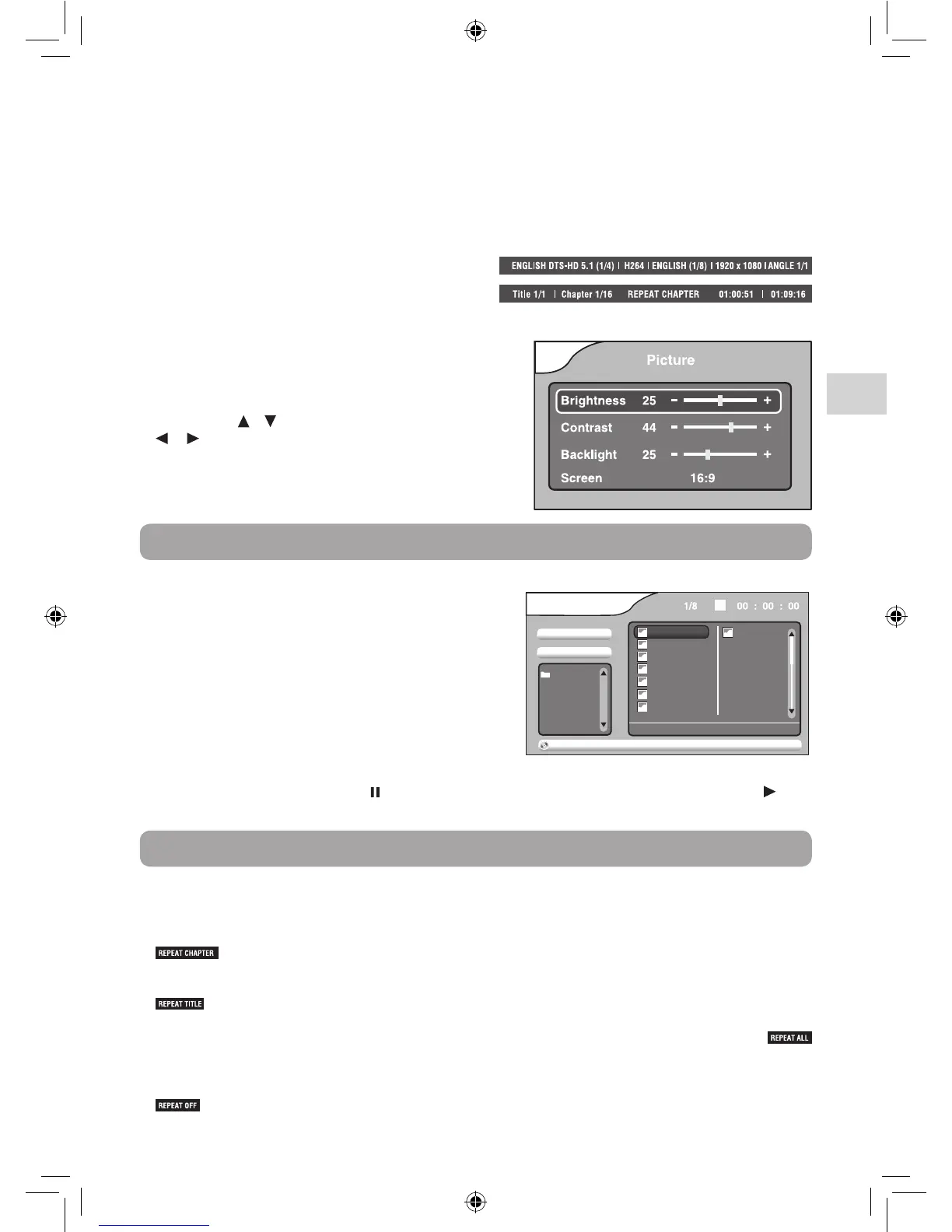Usted puede reproducir un título o capítulo de manera repetida. (Title repeat, chapter repeat, A-B repeat).