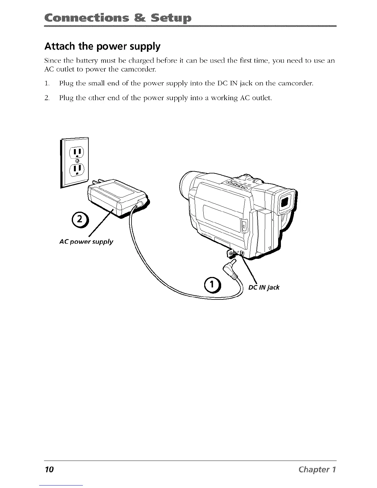 1. Plug the, small end of the" pow_'r supply into the I)C IN jack on the camcorch'r.