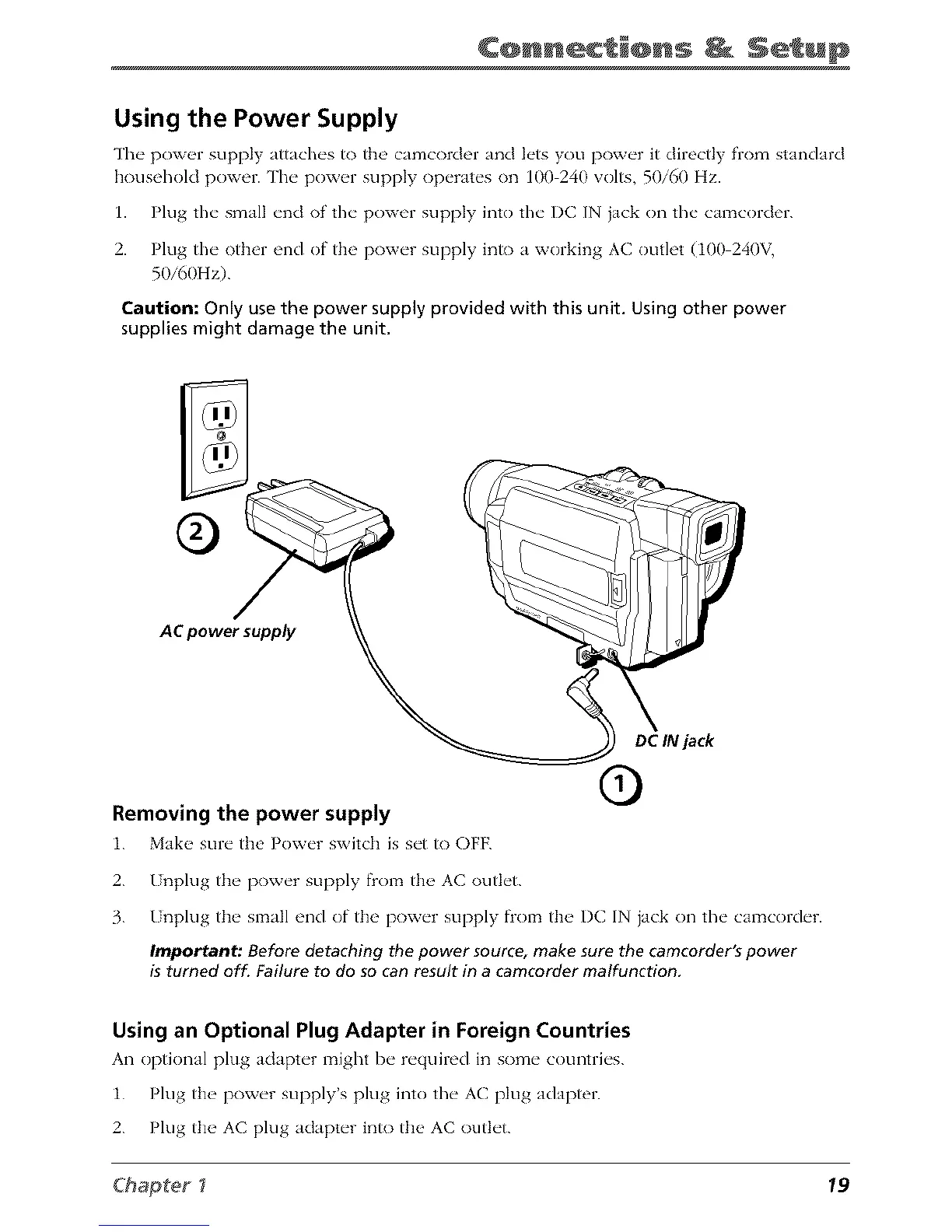 The poxv_q supply attaches to the' camcorder and lets you power it directly from standard