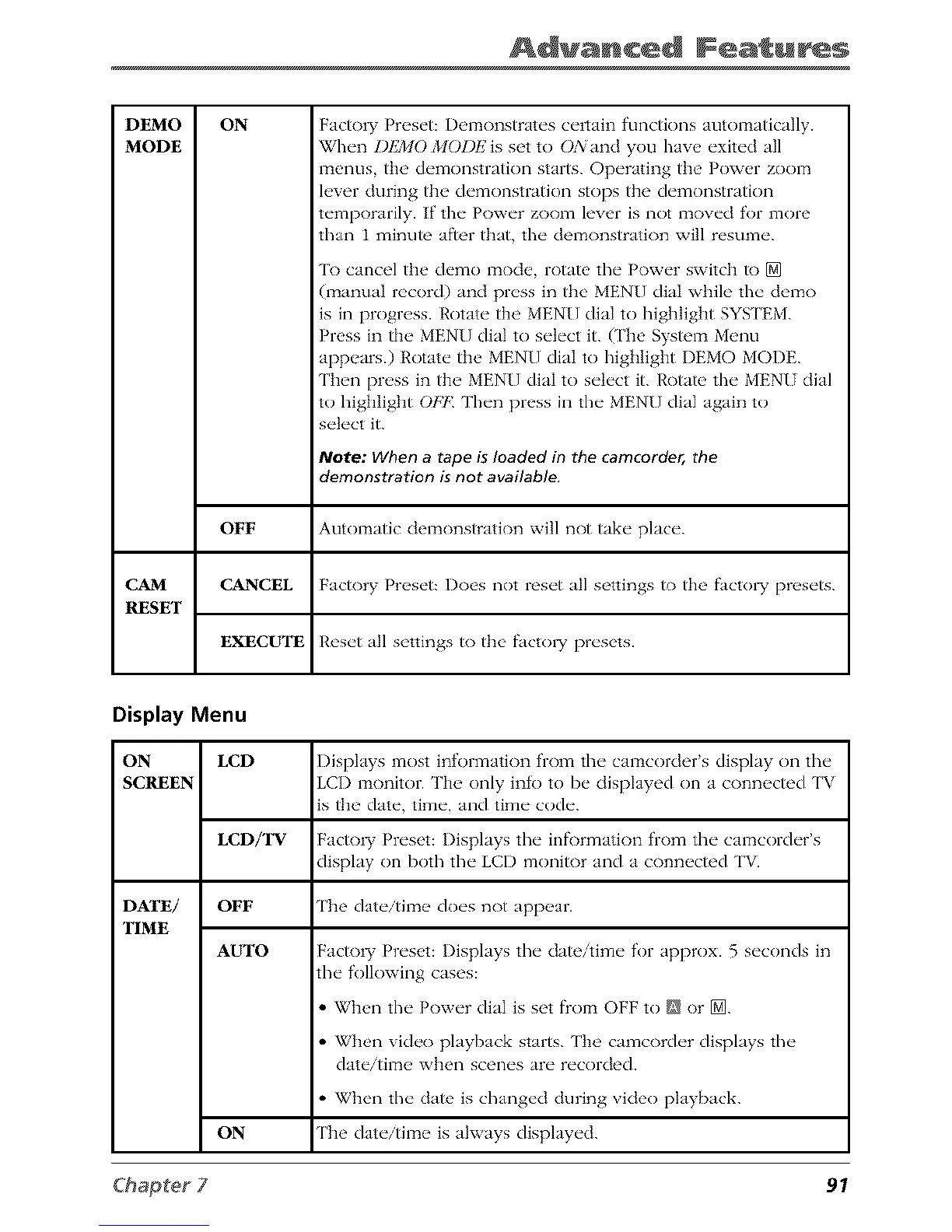 CAM CANCEL Factory Preset: Does not reset all settings to the facto1T presets.