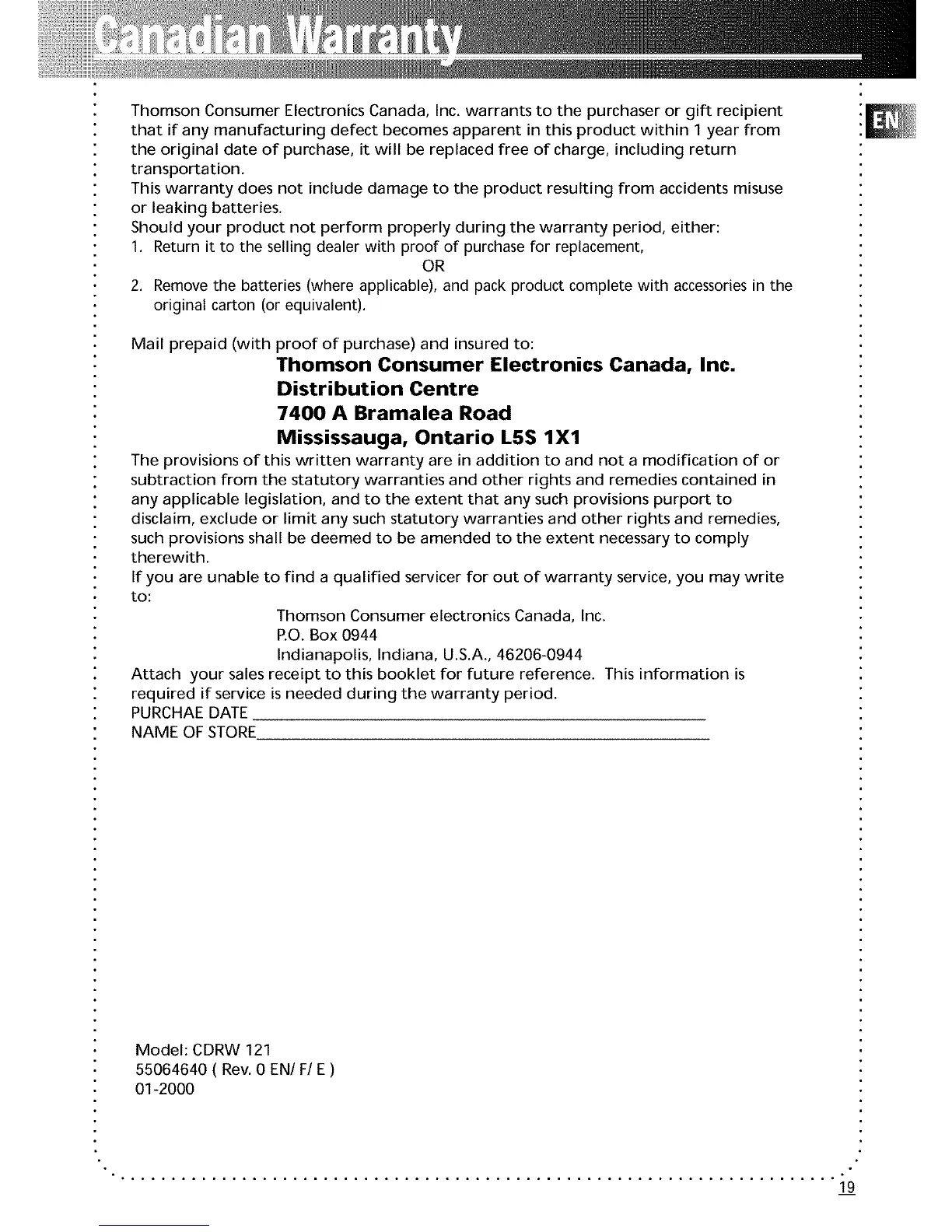 Thomson Consumer Electronics Canada, Inc. warrants to the purchaser or gift recipient