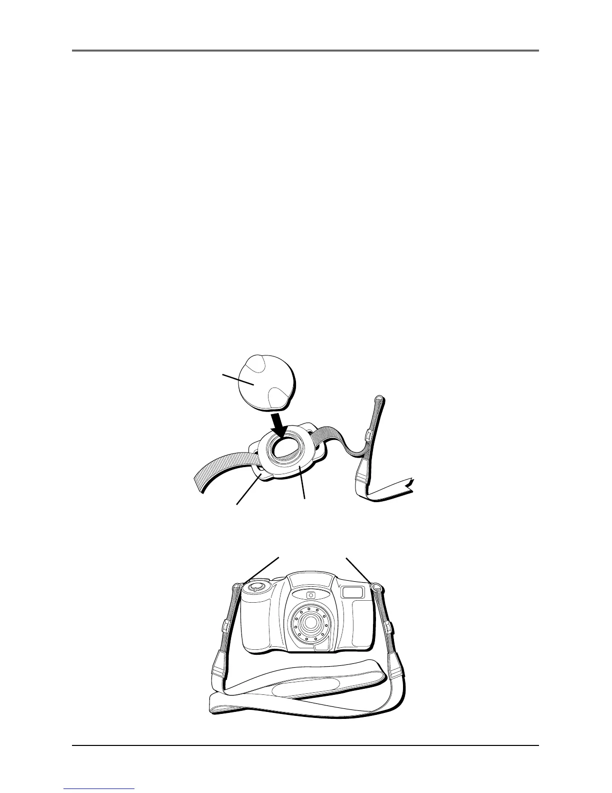1. Before attaching the neck strap, thread the lens cover holder eyelets through one of