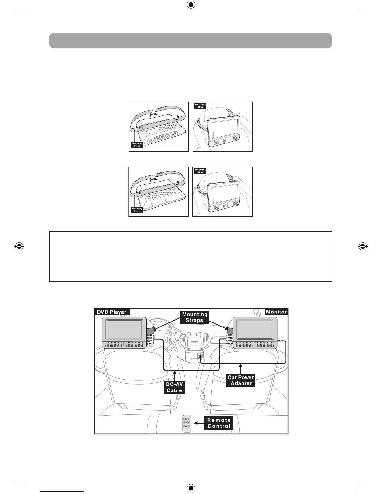 Use the supplied mounting straps to install the DVD player and monitor on the back of the vehicle's headrests.