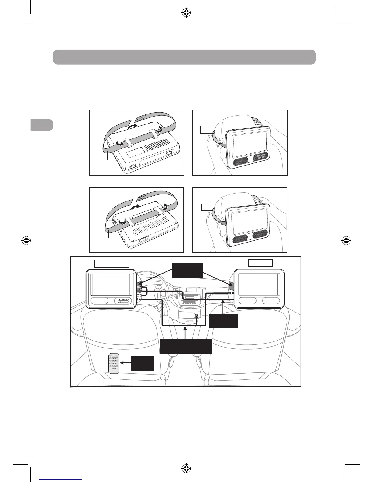 Use the supplied mounting straps to install the DVD Player and the monitor on the back