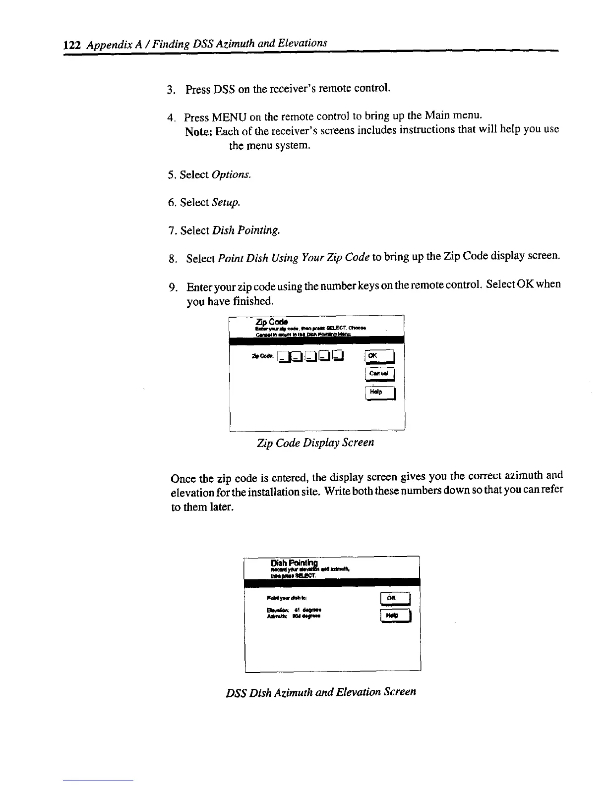 8. Select Point Dish Using Your Zip Code to bring up the Zip Code display screen.