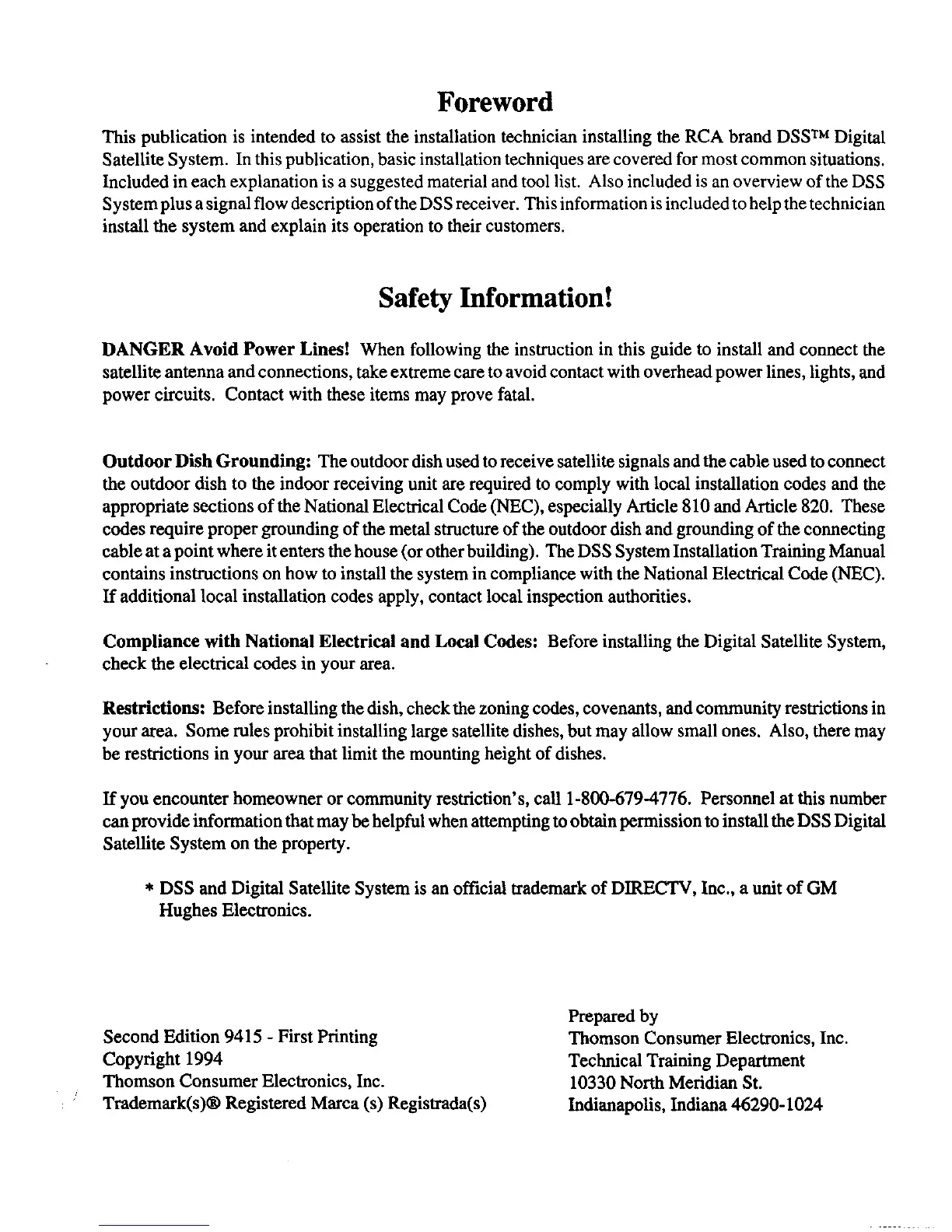 This publication is intended to assist the installation technician installing the RCA brand DSS TM Digital