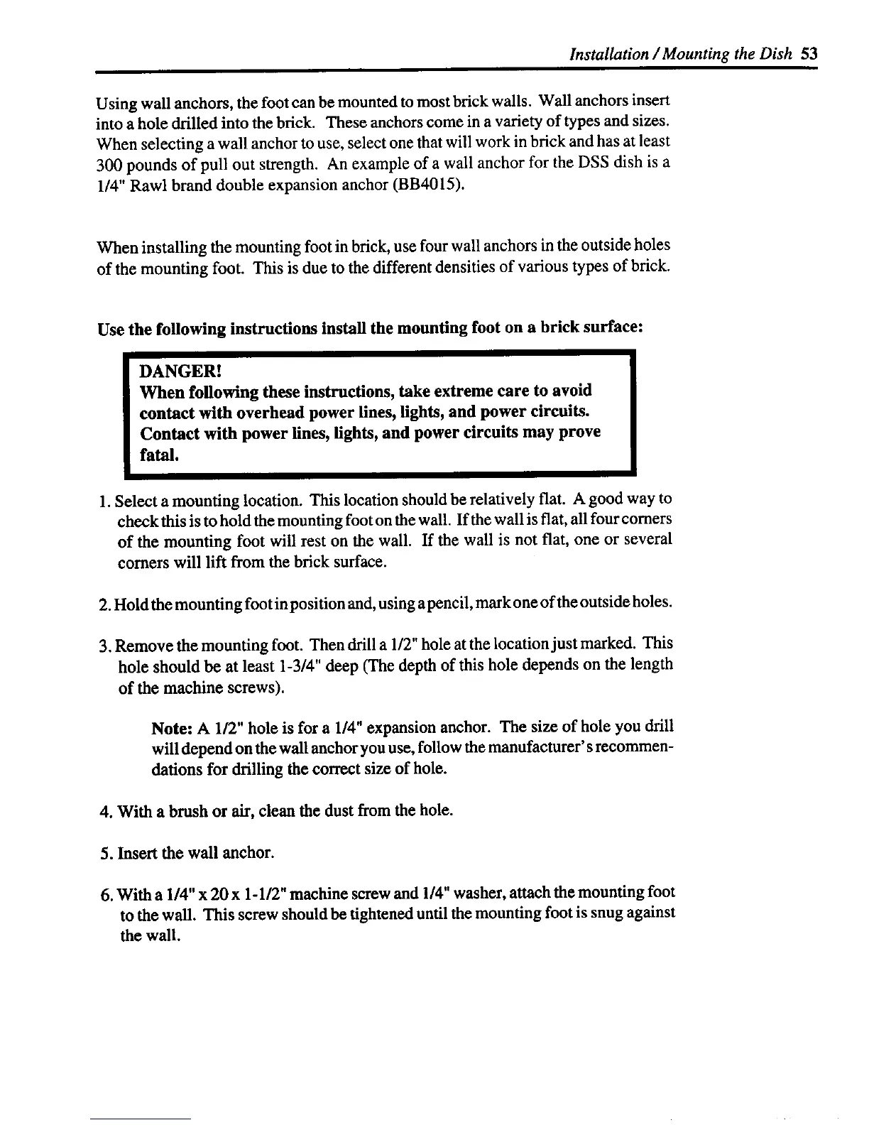 300 pounds of pull out strength. An example of a wall anchor for the DSS dish is a