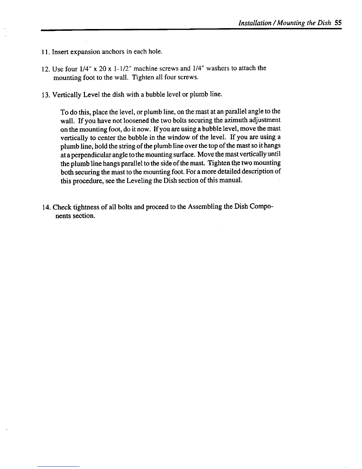 14. Check tightness of all bolts and proceed to the Assembling the Dish Compo-