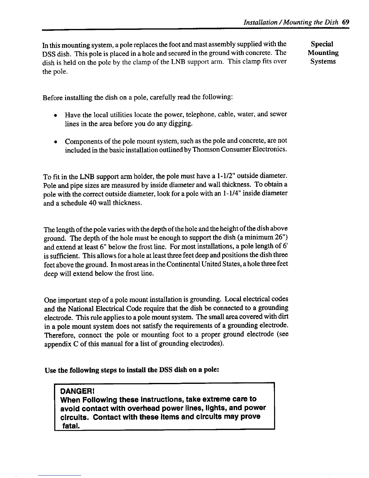 DSS dish. This pole is placed in a hole and secured in the ground with concrete. The