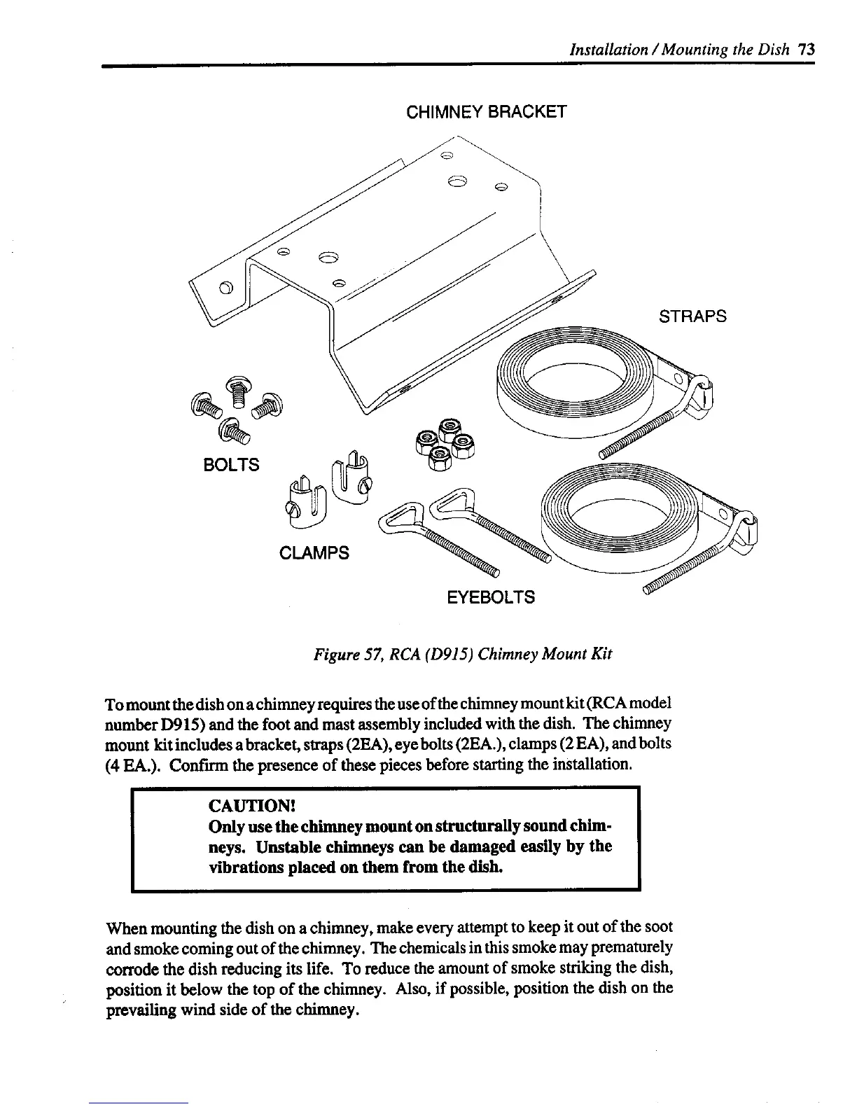 To mount the dish on achimney requiresthe use of the chimney mount kit (RCA model