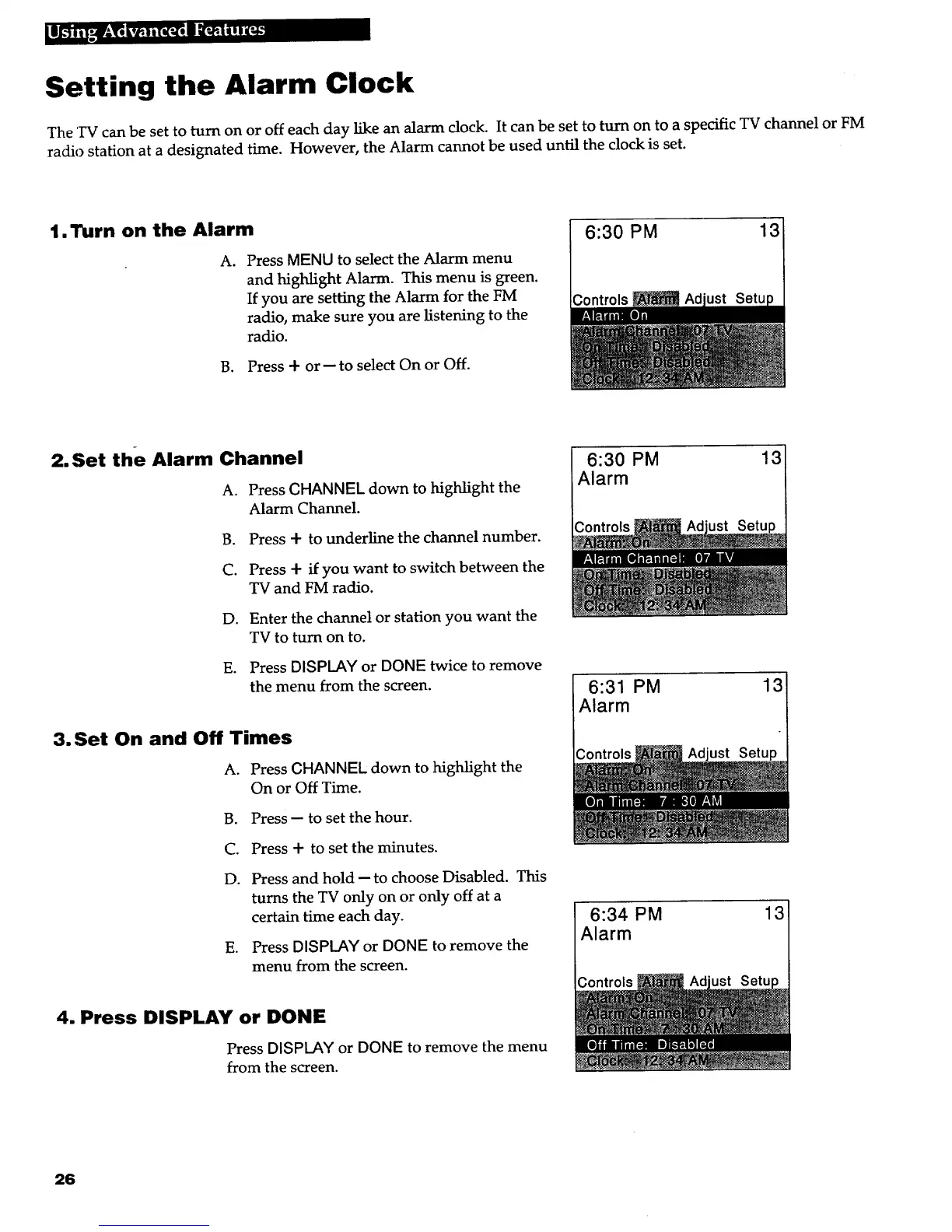 The 'IV can be set to mm on or off each day like an alarm clock It can be set to turn on to a specific TV channel or FM