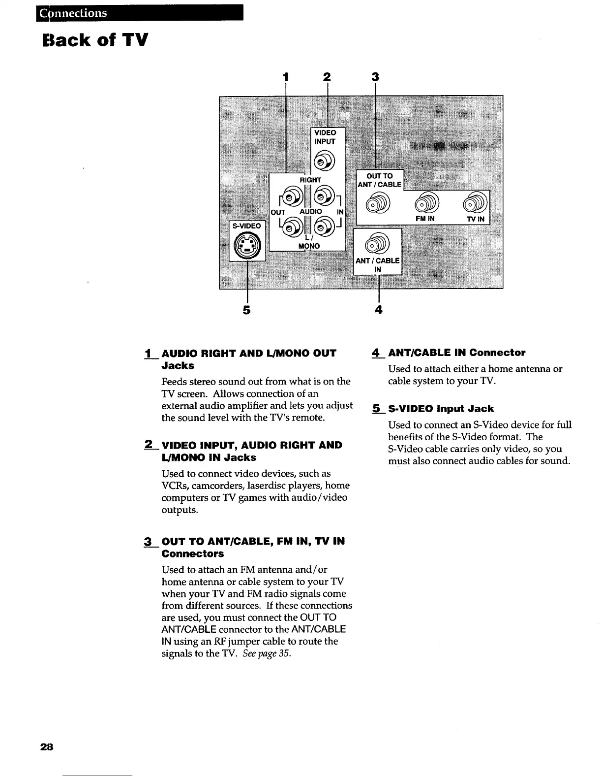3 OUT TO ANT/CABLE, FM IN, TV IN