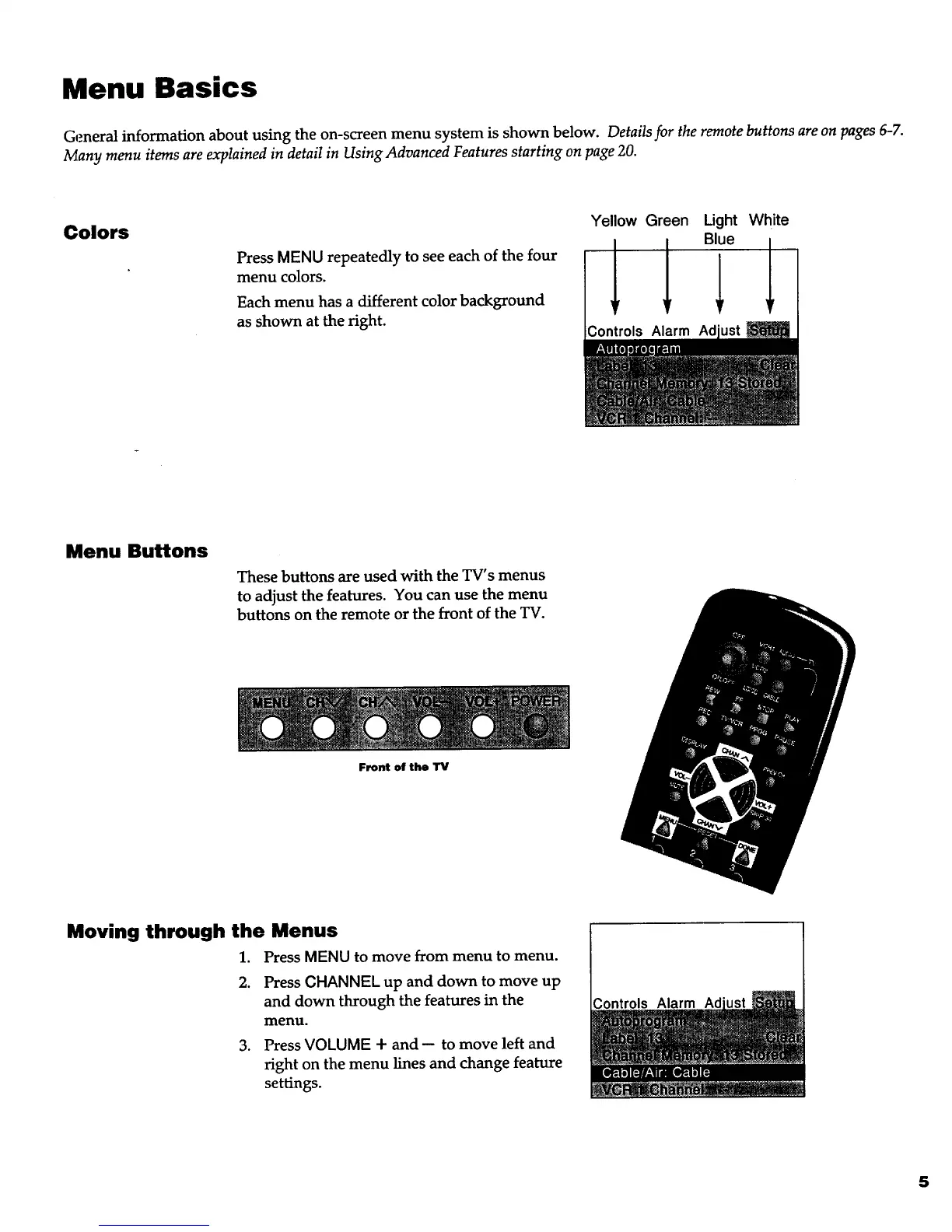 General information about using the on-screen menu system is shown below. Details for the remote buttons are on pages 6-7.