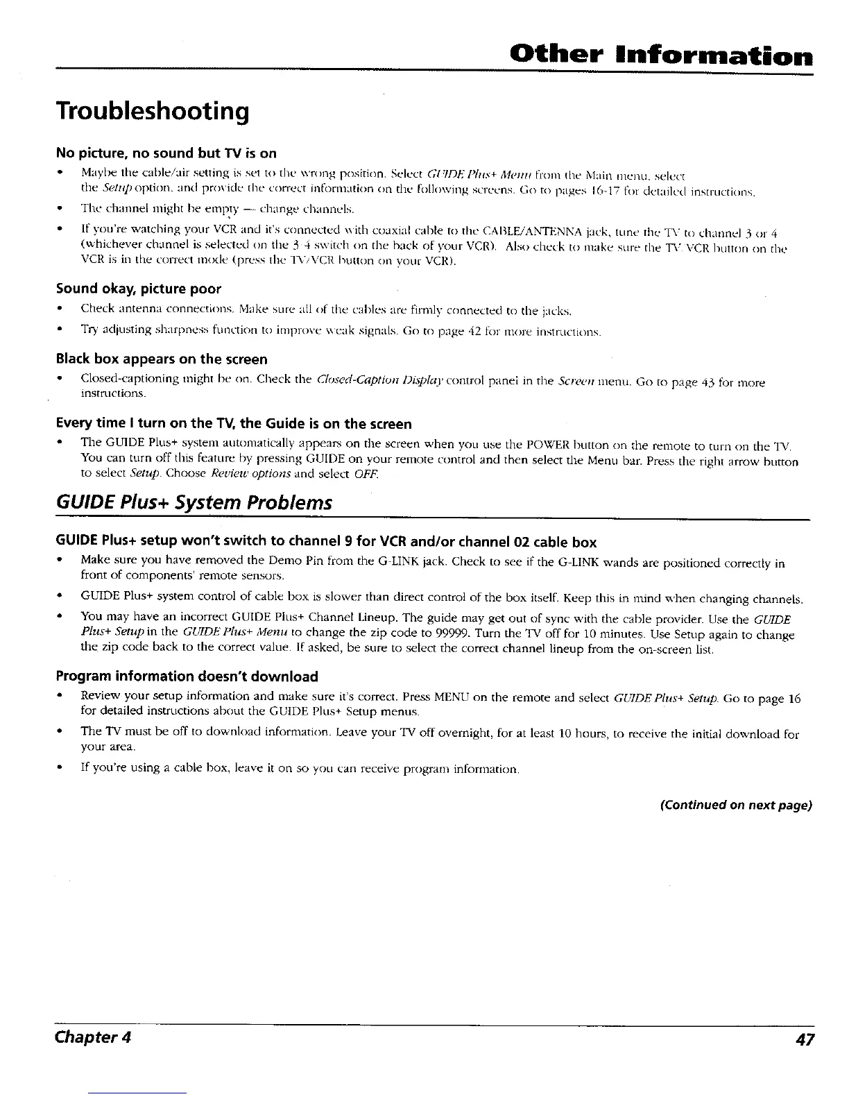 Review your setup information and make sure it's correct. Press MENU on the remote and select GUIDEPhls+ Setup. Go to page 16