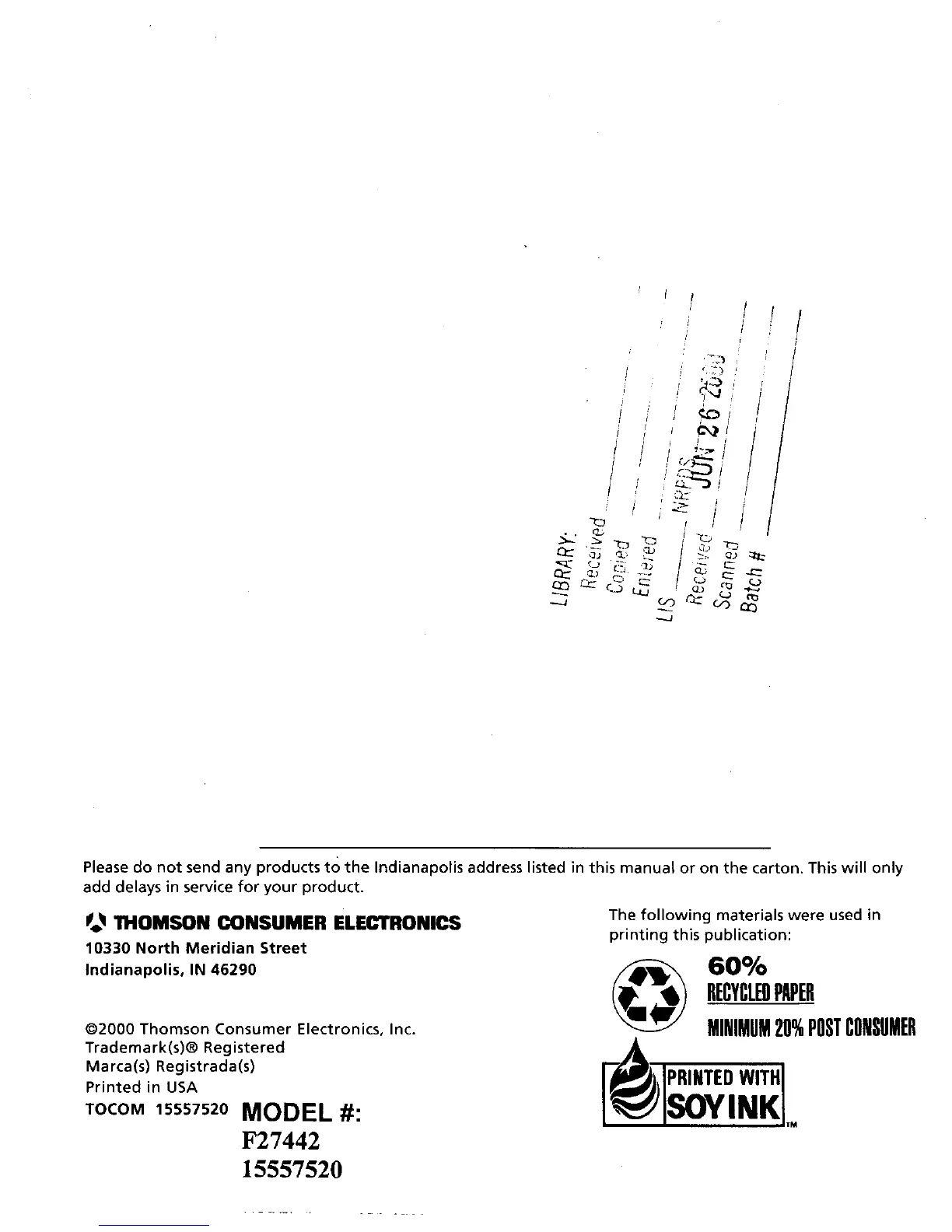 Please do not send any products to the Indianapolis address listed in this manual or on the carton. This will only
