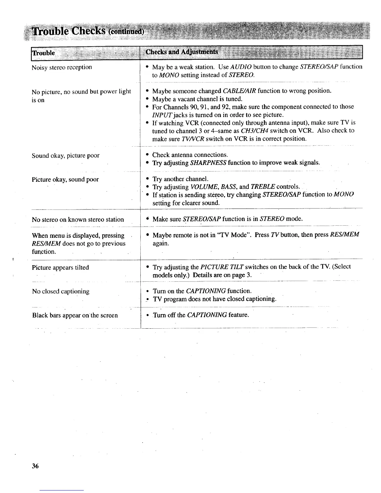 No stereo on known stereo station * Make sure STEREO/SAP function is in STEREO mode.