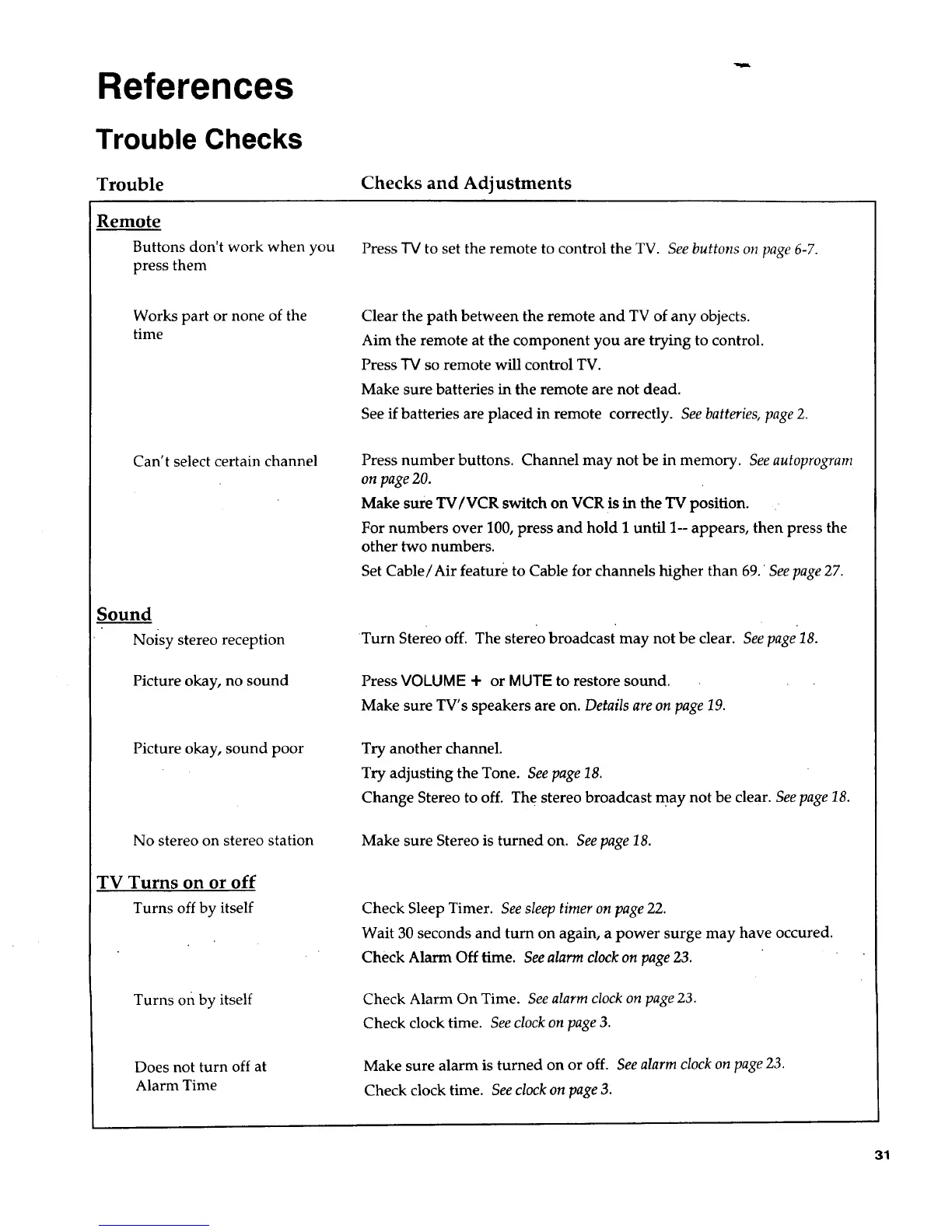 Make sure alarm is turned on or off. See alarm clock on page 23.
