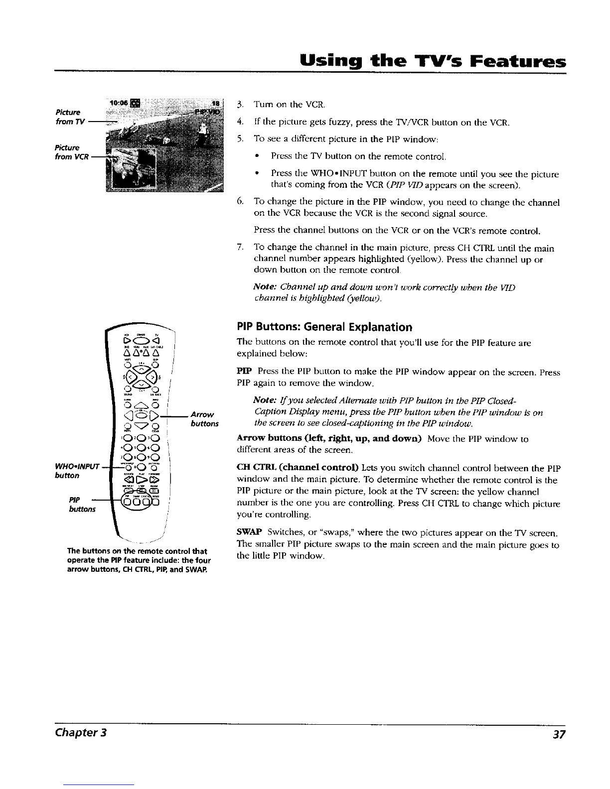 arrow buttons, CH CTRL, PIP, and SWAP.