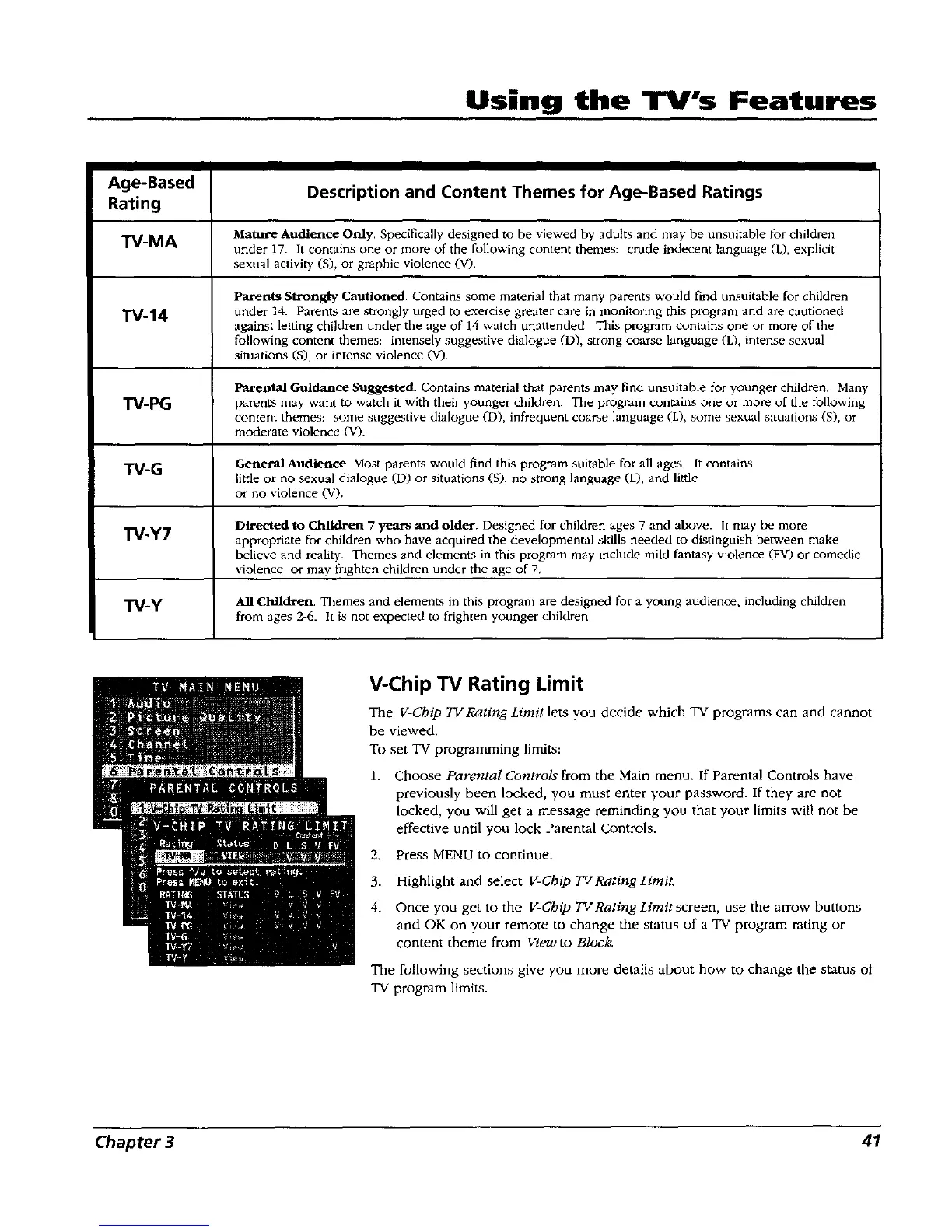 The V-Chip TVRating Limit lets you decide which TV programs can and cannot