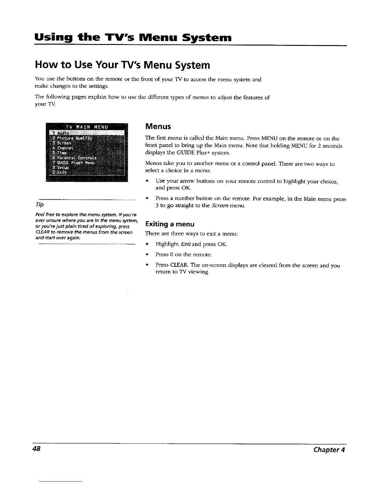 The first menu is called the Main menu. Press MENU on the remote or on the