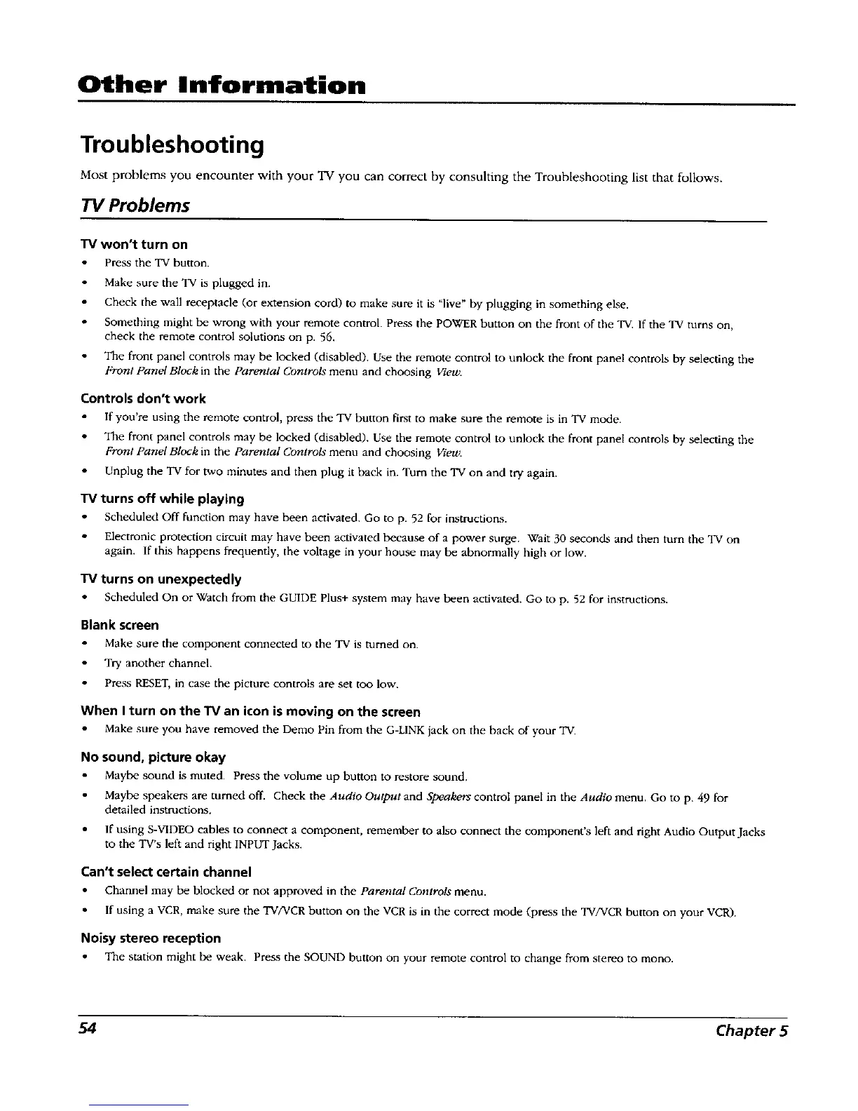Most problems you encounter with your TV you can correct by consulting the Troubleshooting list that follows.