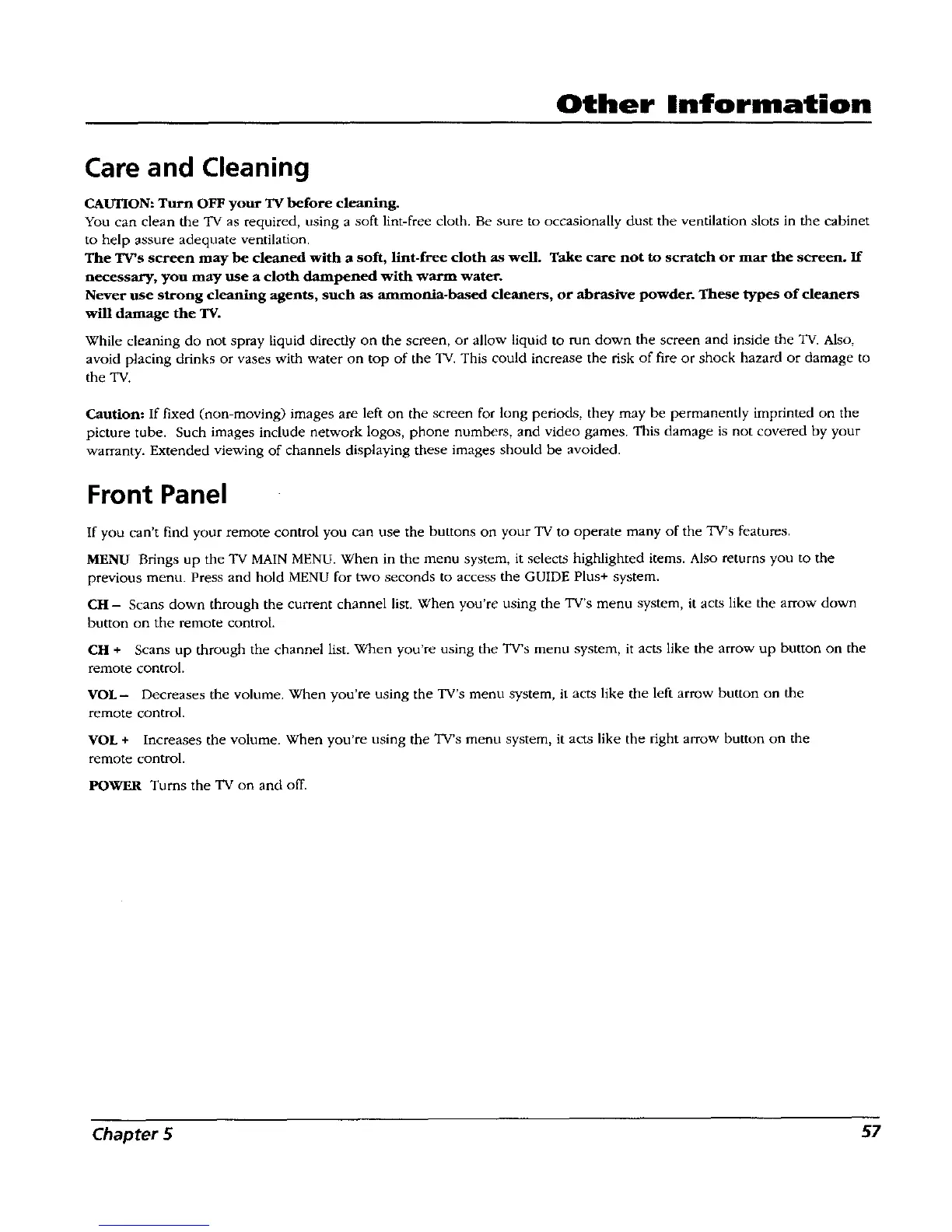 picture tube. Such images include network logos, phone numbers, and video games. This damage is not covered by your