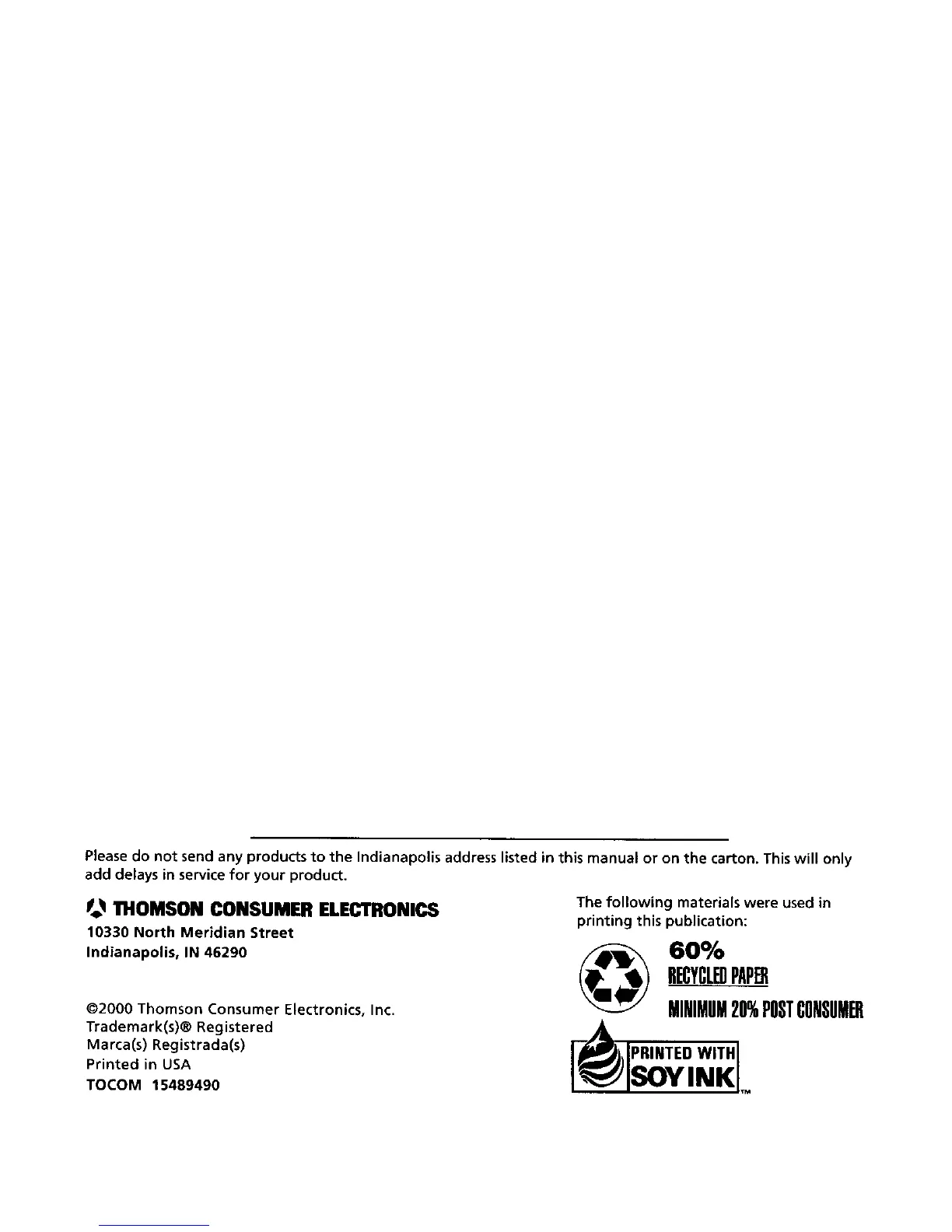 Please do not send any products to the Indianapolis address listed in this manual or on the carton. This will only