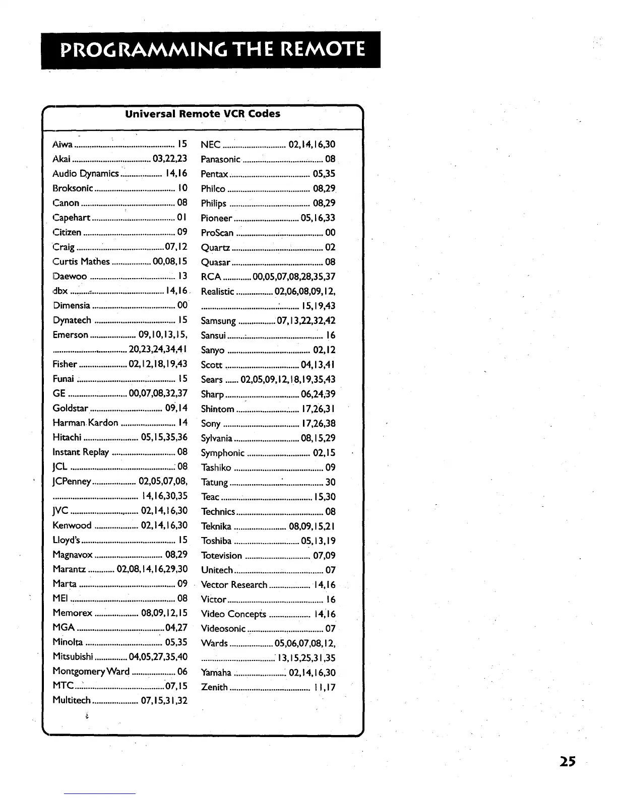 Universal Remote VCR Codes