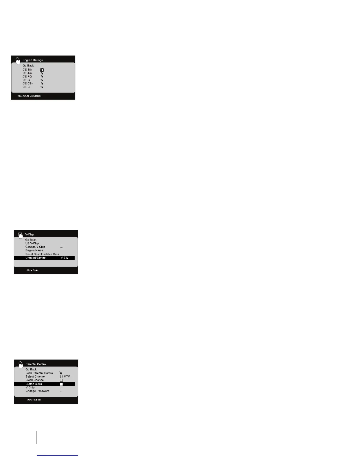 Si usted recibe programas de Canadá, puede bloquear la V-Chip para francés e inglés de Canadá por clas-
