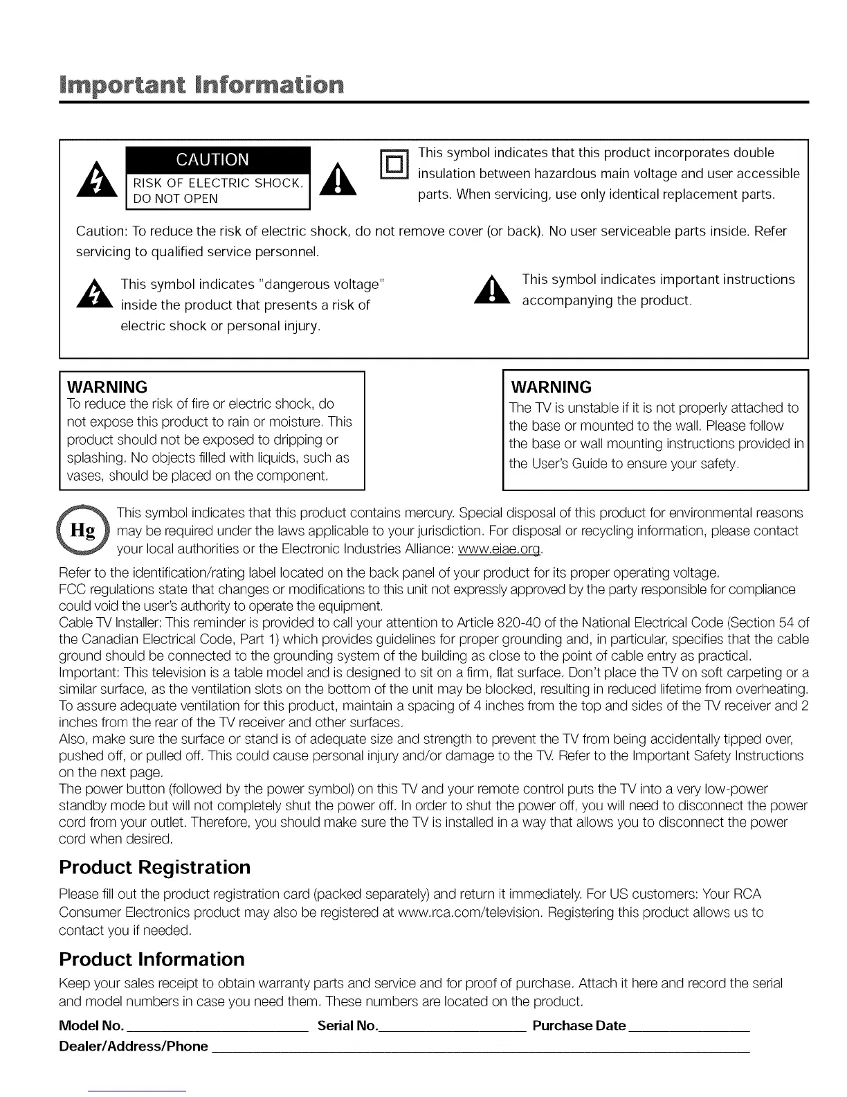 Consumer Electronics product may also be registered at www.rca.com/television. Registering this product allows us to