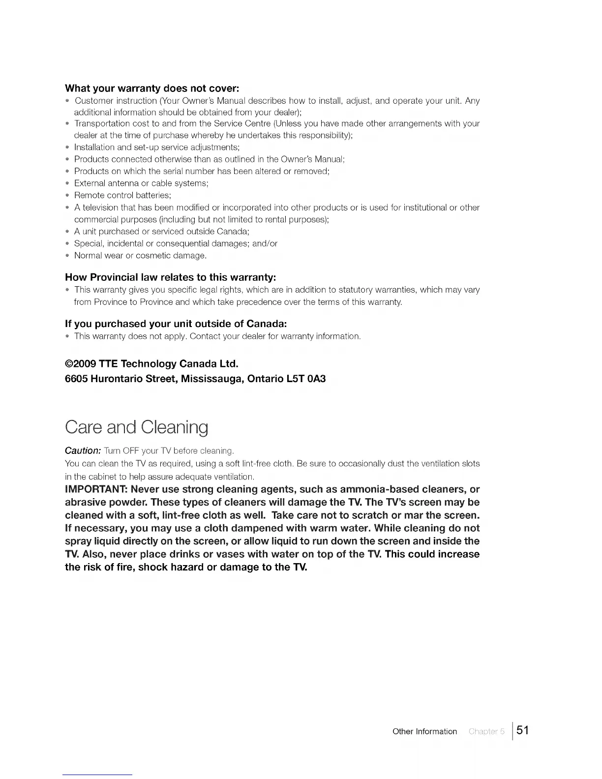 abrasive powder. These types of cleaners will damage the TV. The TV's screen may be