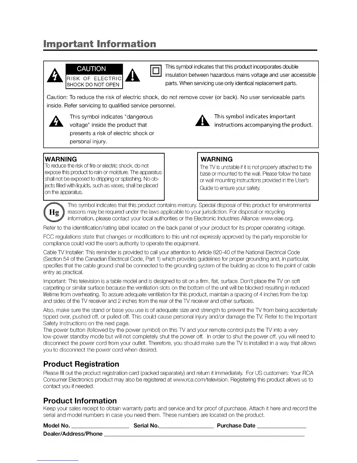 Consumer Electronics product may also be registered at www.rca.com/television. Registering this product allows us to