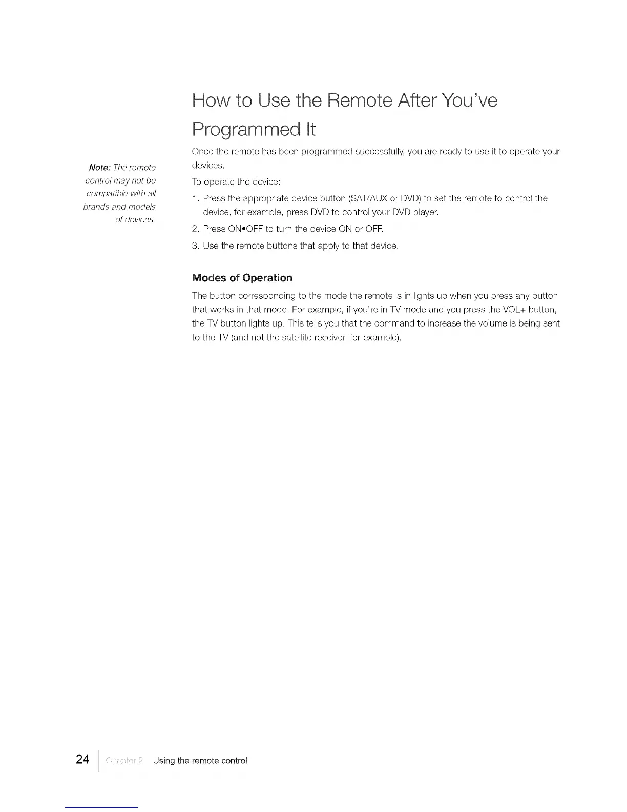 1. Press the appropriate device button (SAT/AUX or DVD) to set the remote to control the