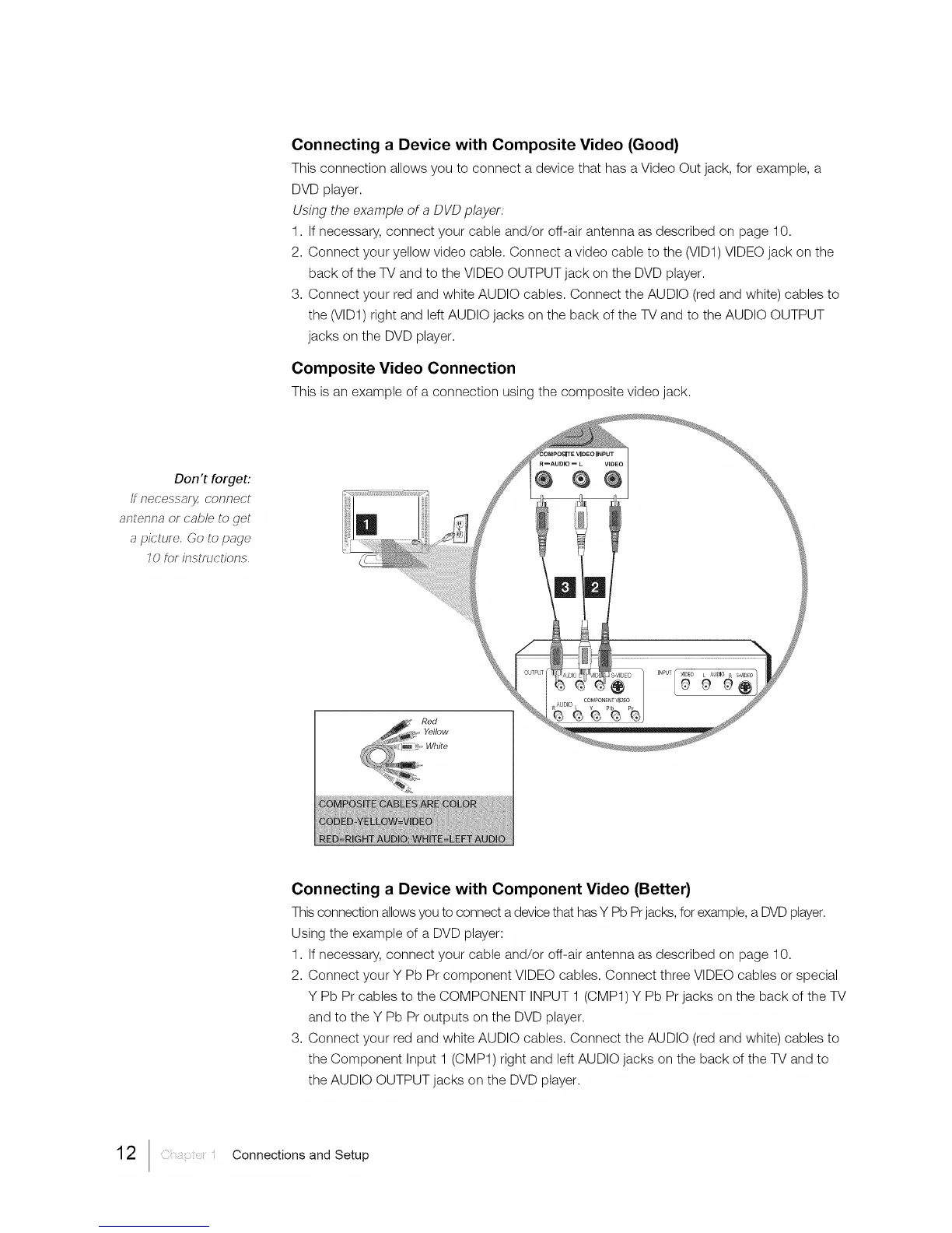 This connection allows you to connect a device that has Y Pb Prjacks, for example, a DVD player.