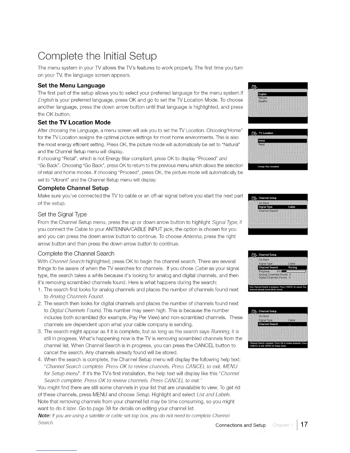 things to be aware of when the TV searches for channels. If you chose Cable as your signal