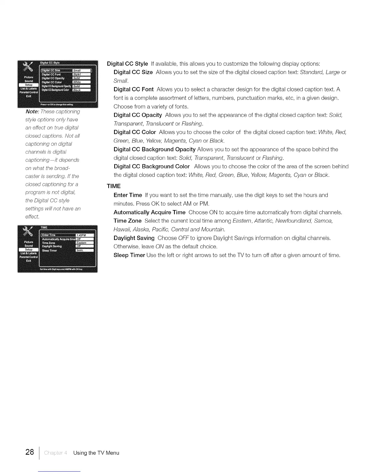 Digital CO Size Allows you to set the size of the digital closed caption text: Standard, Large or