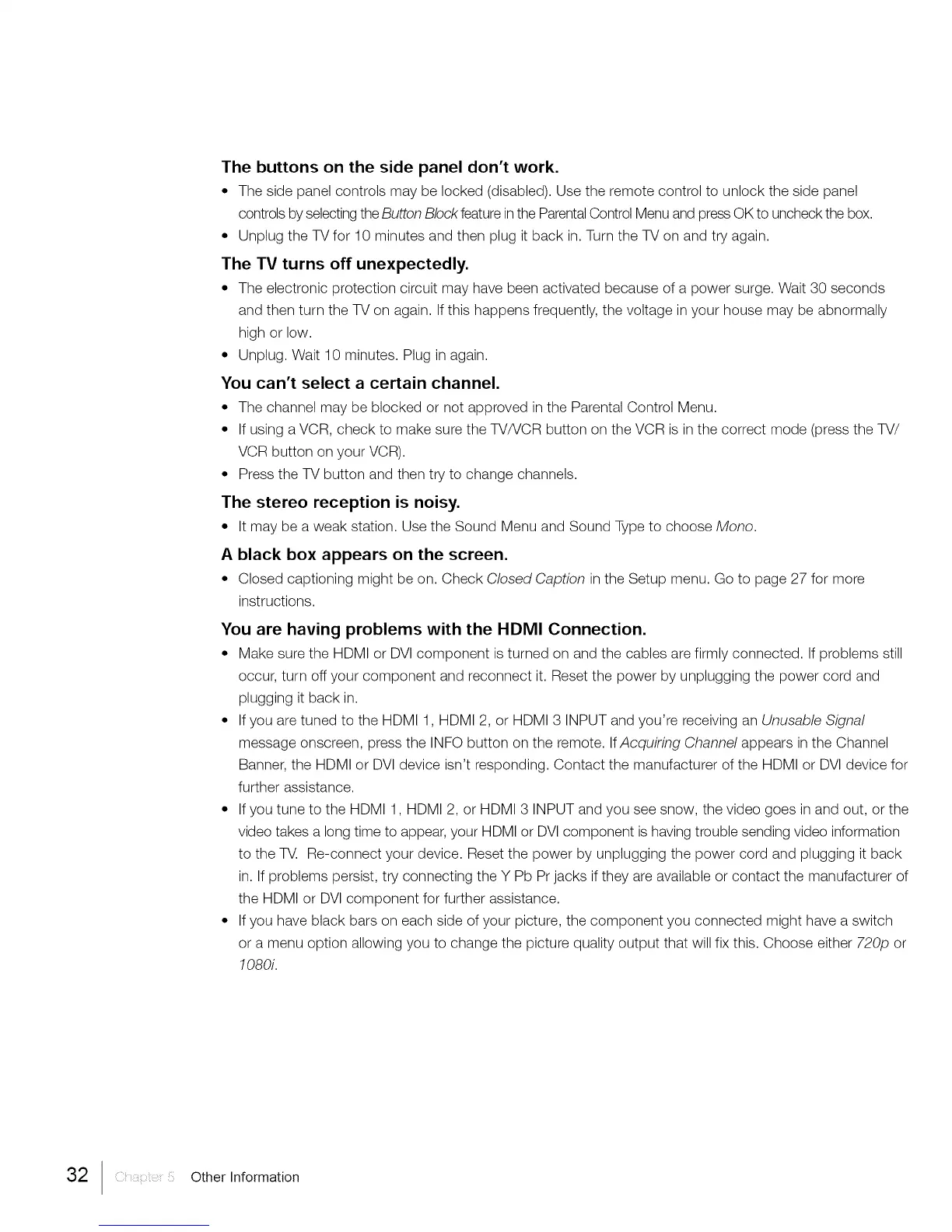and then turn the TV on again. If this happens frequently, the voltage in your house may be abnormally