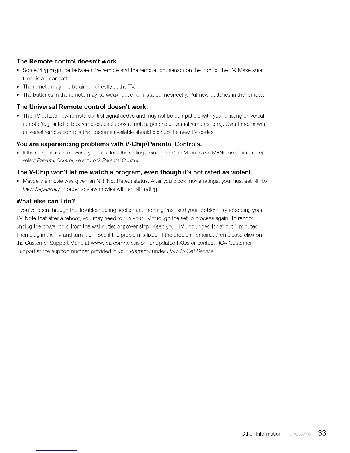 the Customer Support Menu at www.rca.com/television for updated FAQs or contact RCA Customer