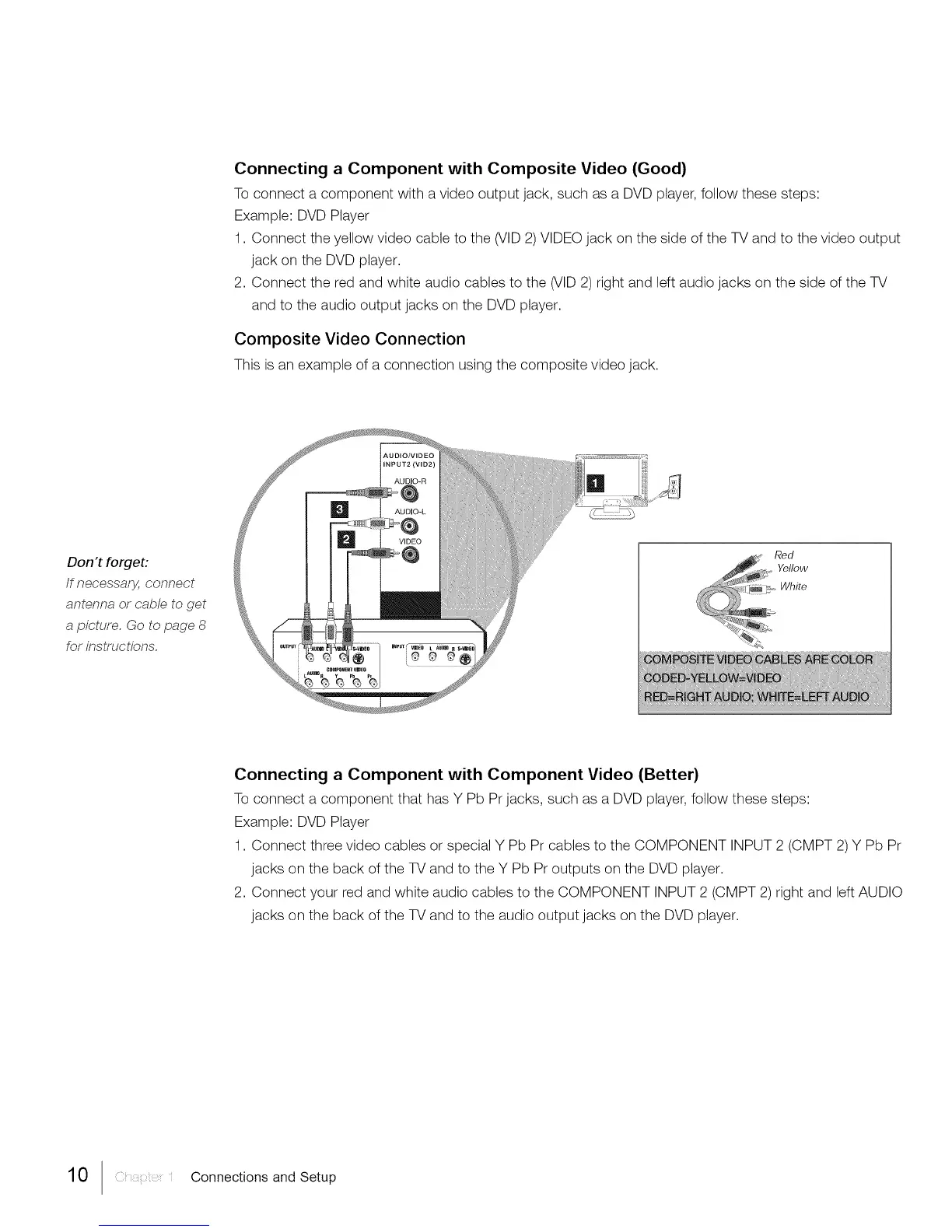 To connect a component that has Y Pb Pr jacks, such as a DVD player, follow these steps: