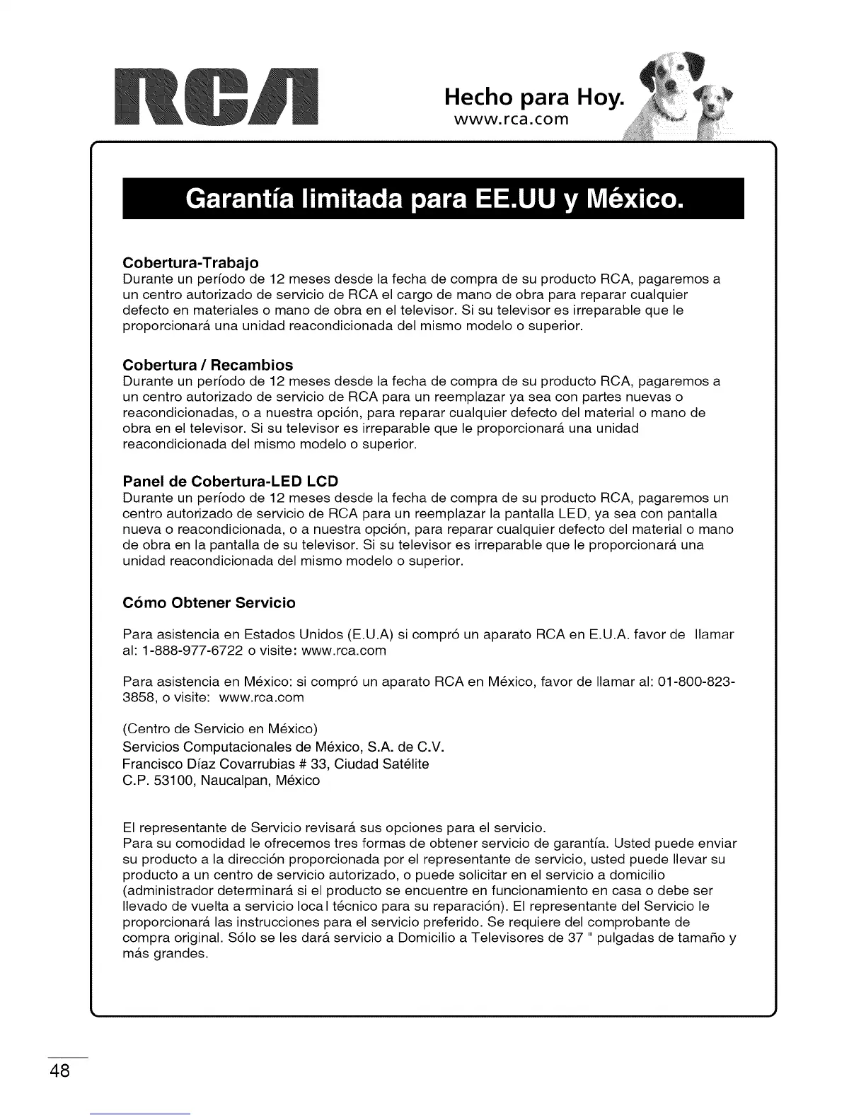 Para asistencia en Estados Unidos (E.U.A) si compr6 un aparato RCA en E.U.A. favor de Ilamar