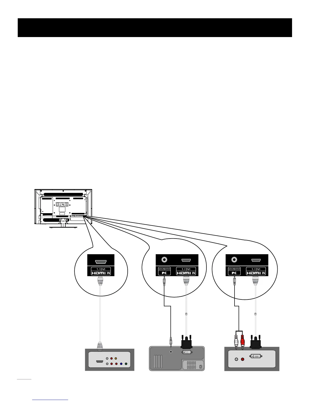 1. Connect the HDMI 1/DVI, 2, or 3 jack on the back of TV to the DVI port of device via HDMI-DVI cable.
