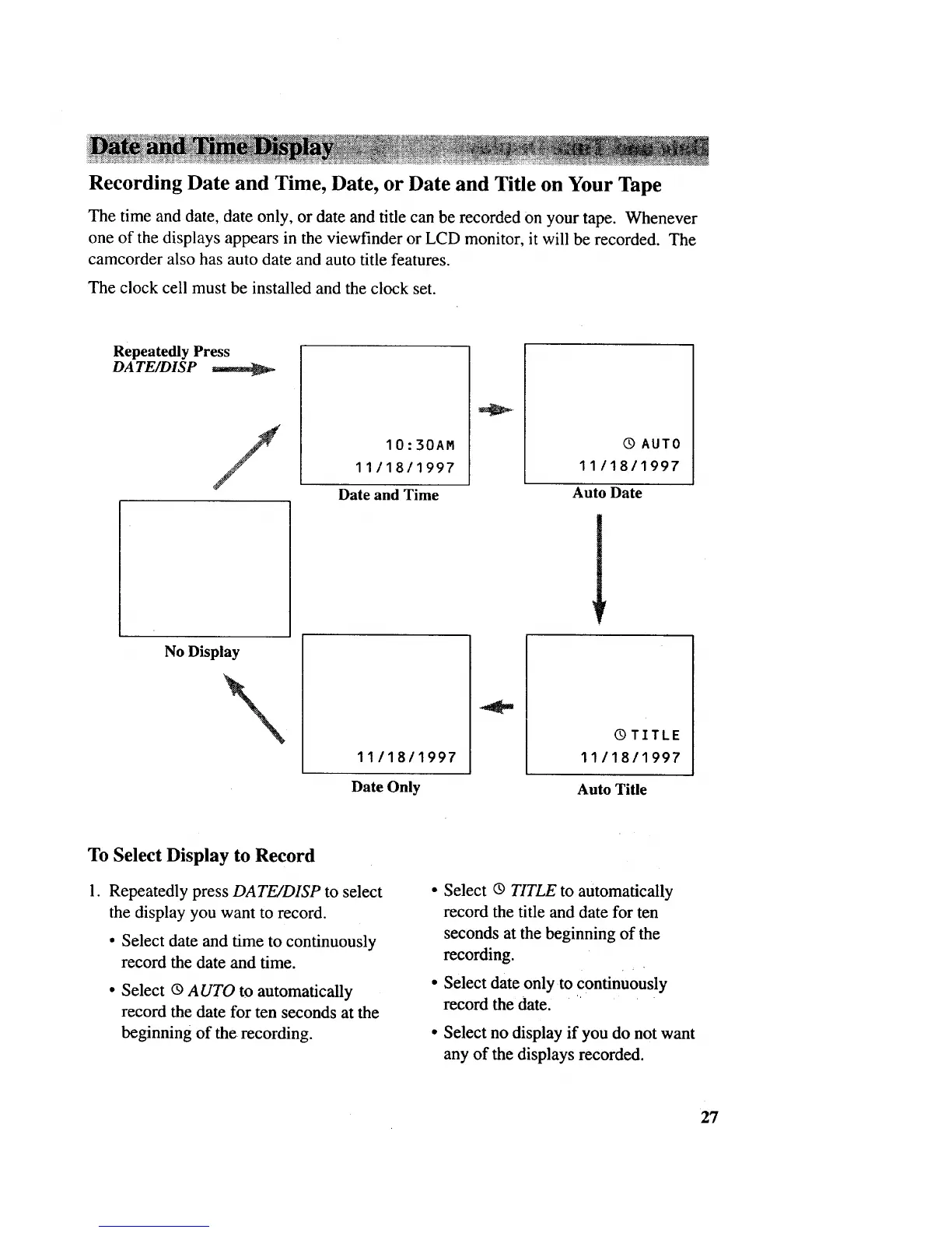 The time and date, date only, or date and title can be recorded on your tape. Whenever