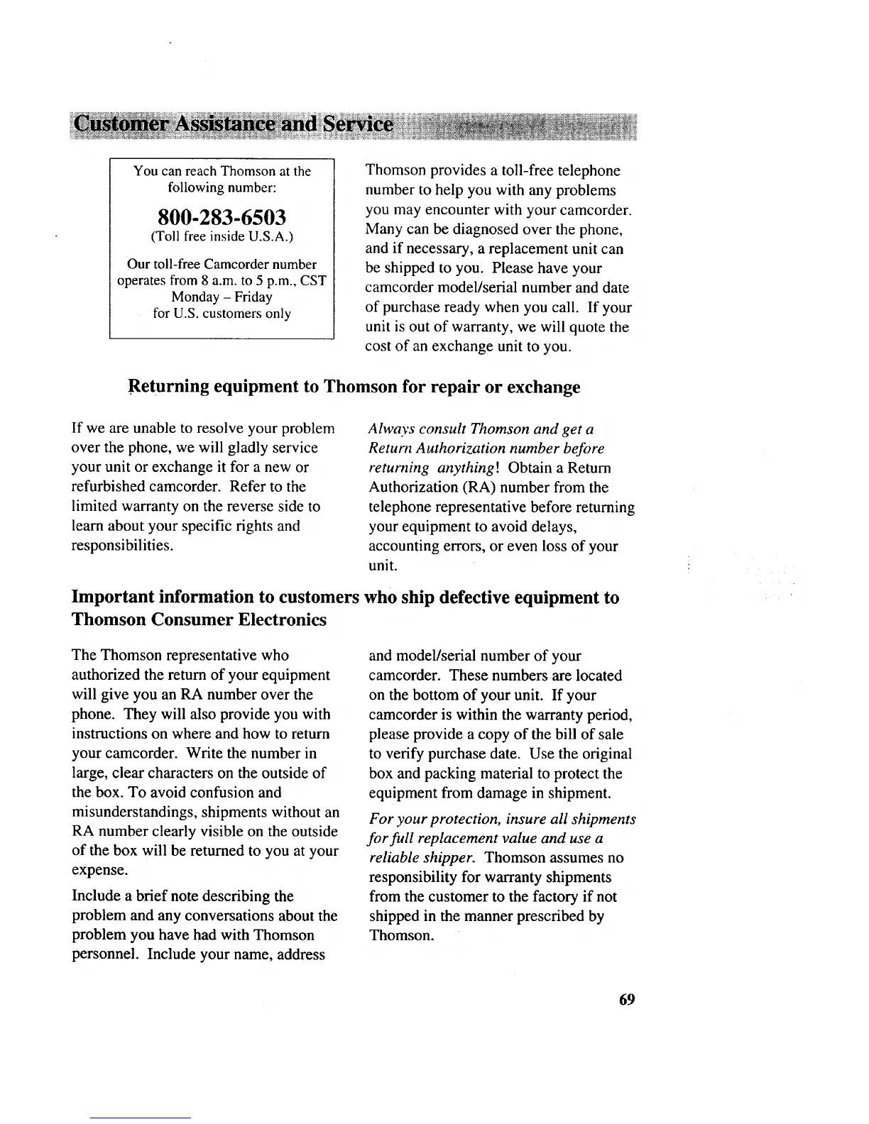 Returning equipment to Thomson for repair or exchange