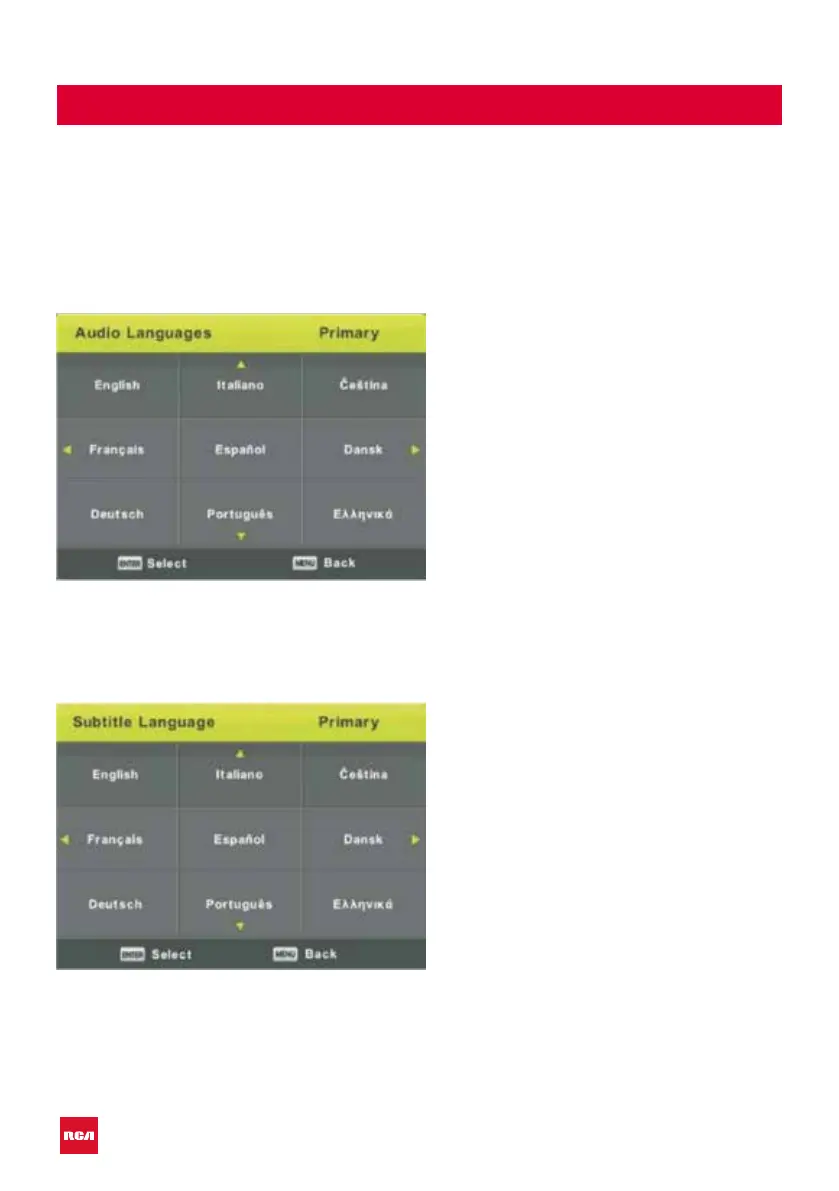 ‘Audio Language’ menu. The ‘Audio Language’ window is illustrated, and press