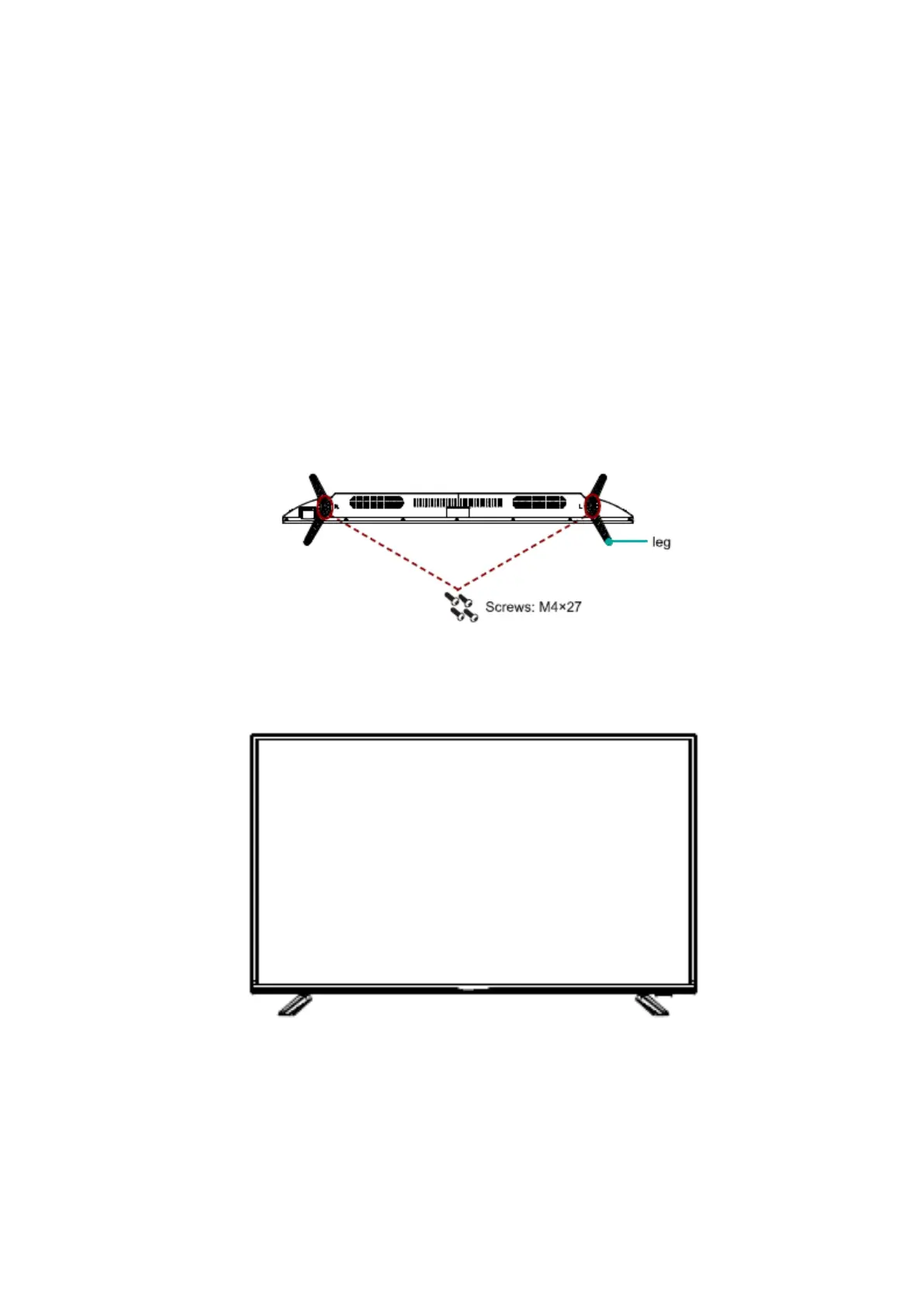 2. Place the legs into the bottom slots of the TV, insert and tighten the screws (found in the