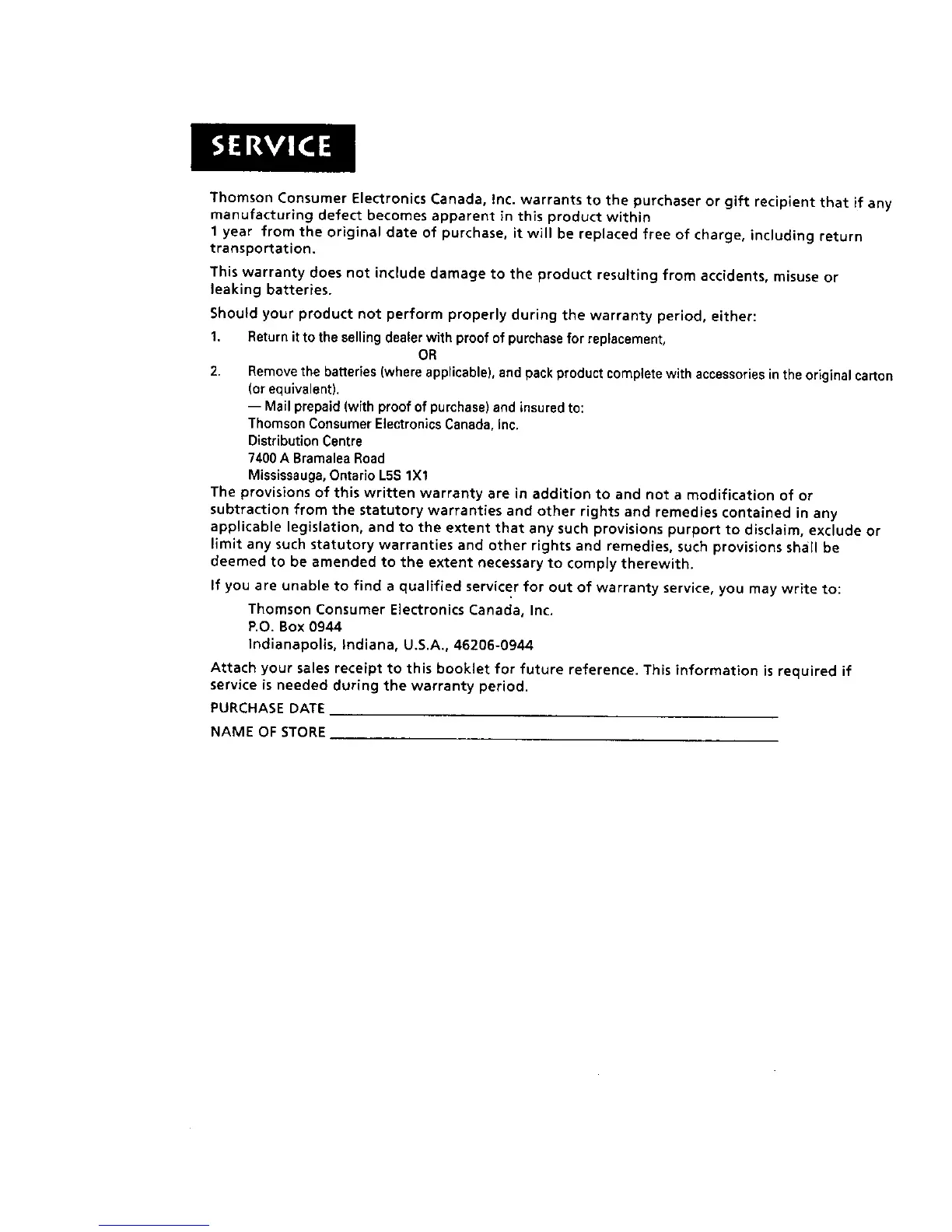 ThomsonConsumer Electronics Canada, Inc. warrants to the purchaser or gift recipient that if any