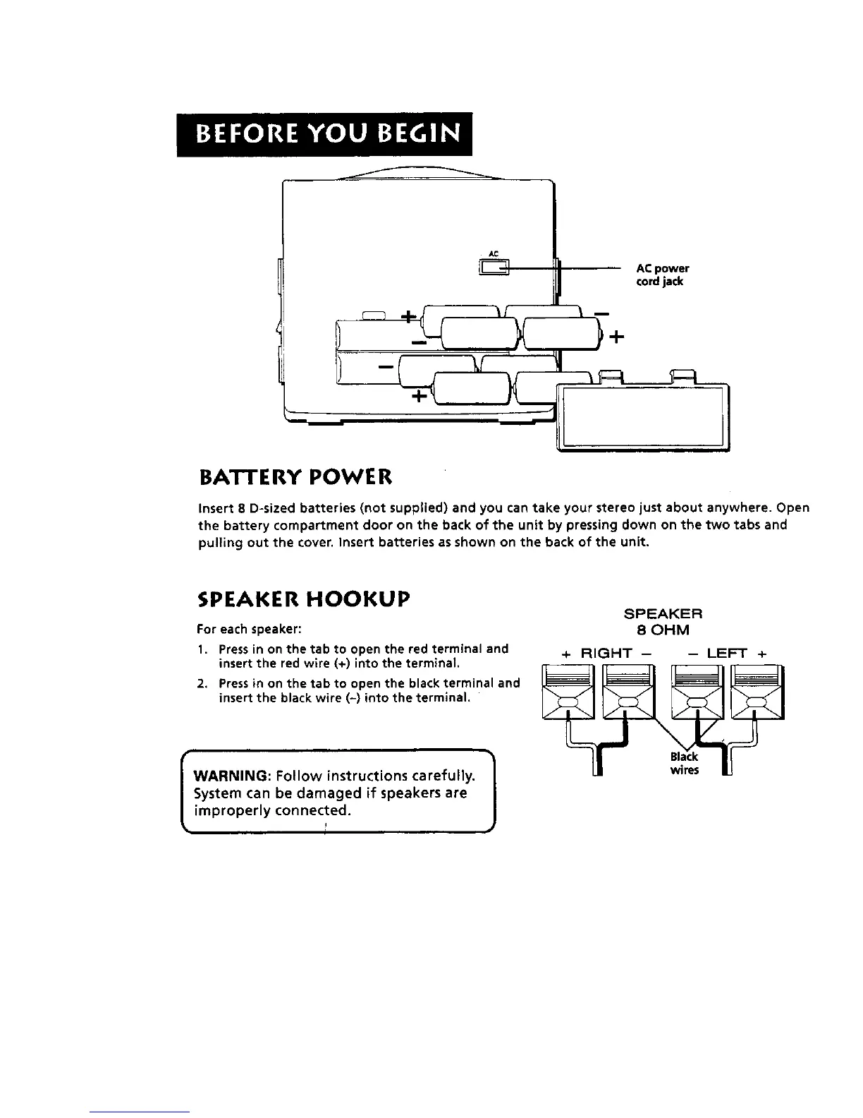 Insert 8 D-sized batteries (not supplied) and you can take your stereo just about anywhere. Open