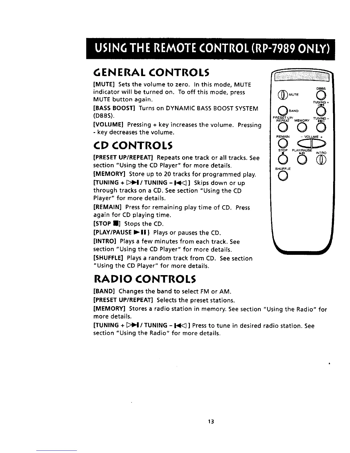 [TUNING + _/TUNING - _ ] Press to tune in desired radio station. See