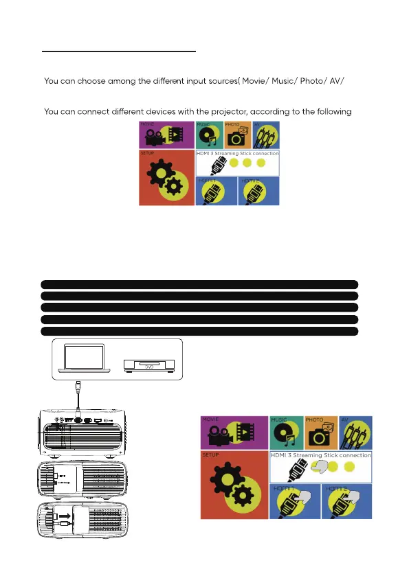 The projector can connect to devices with HDMI input function. It is compatible