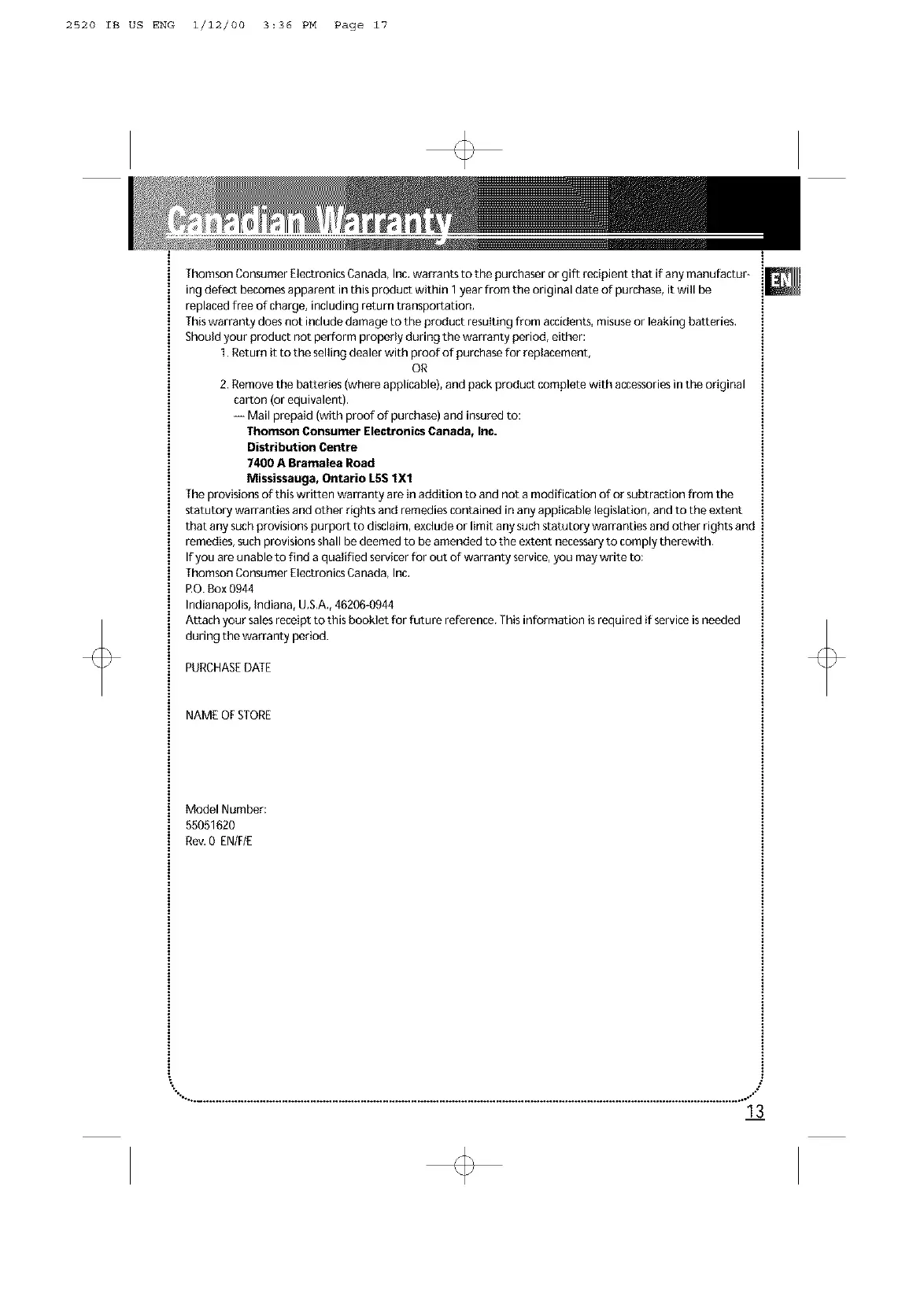 Thomson Consumer Electronics Canada, Inc. warrants to the purchaser or gift recipient that if any manufactur-